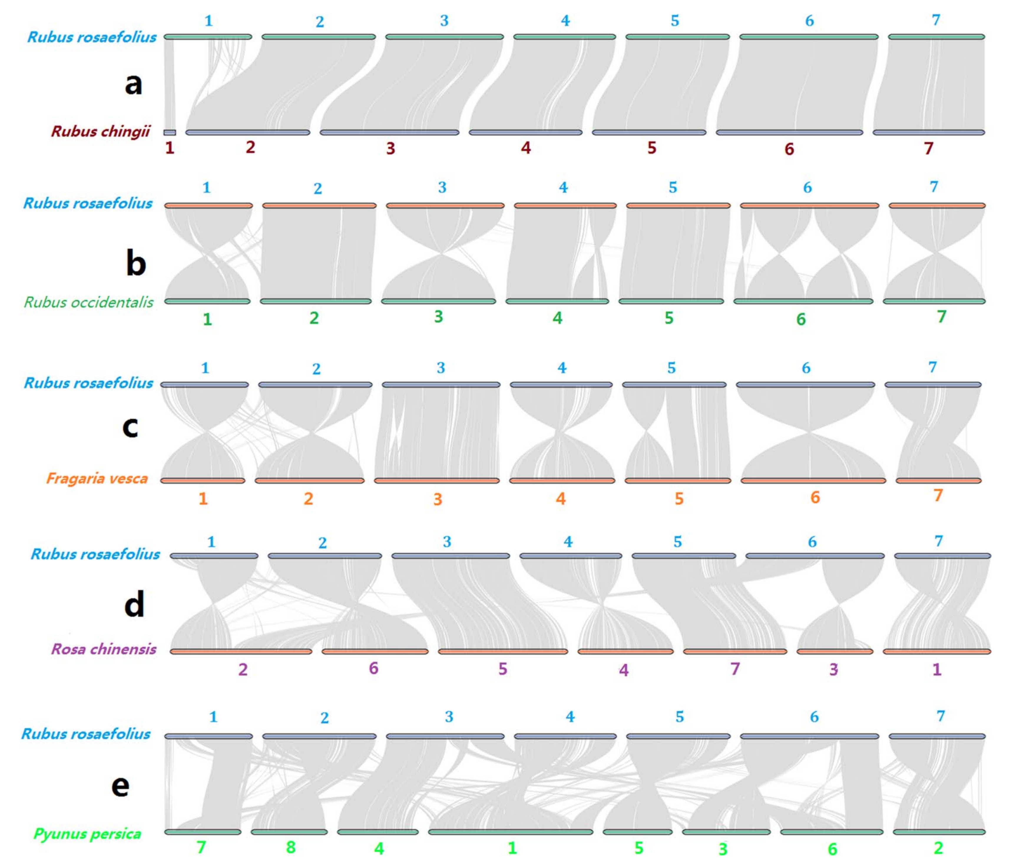 所有的植物都有一個或遠或近的共同祖先。通過共線性分析發(fā)現(xiàn):在1號染色體的一端和其他6條染色體上,發(fā)現(xiàn)了完整且平行的同源物,但在1號染色體的另一端缺失了大同源塊(圖3a)。這些結果表明,空心藨和紅覆盆子之間沒有發(fā)生大的染色體變異,但在空心藨和紅覆盆子基因組草圖的組裝或注釋中隱藏了錯誤。該研究發(fā)現(xiàn),空心藨和紅覆盆子之間所有染色體的共線性幾乎是完整的(圖3b),這表明上述1號染色體的組裝或注釋錯誤可能在空心藨中沒有發(fā)生。當忽略單倍型中支架組裝方向的干擾時,1、2、3、5、7號染色體幾乎完全平行共線性,4號染色體可能發(fā)生較大反轉(zhuǎn),6號染色體可能發(fā)生3次或更少的反轉(zhuǎn)(圖3b)。這些發(fā)現(xiàn)表明,隨著親緣關系距離的增加,復雜染色體變異的數(shù)量增加。