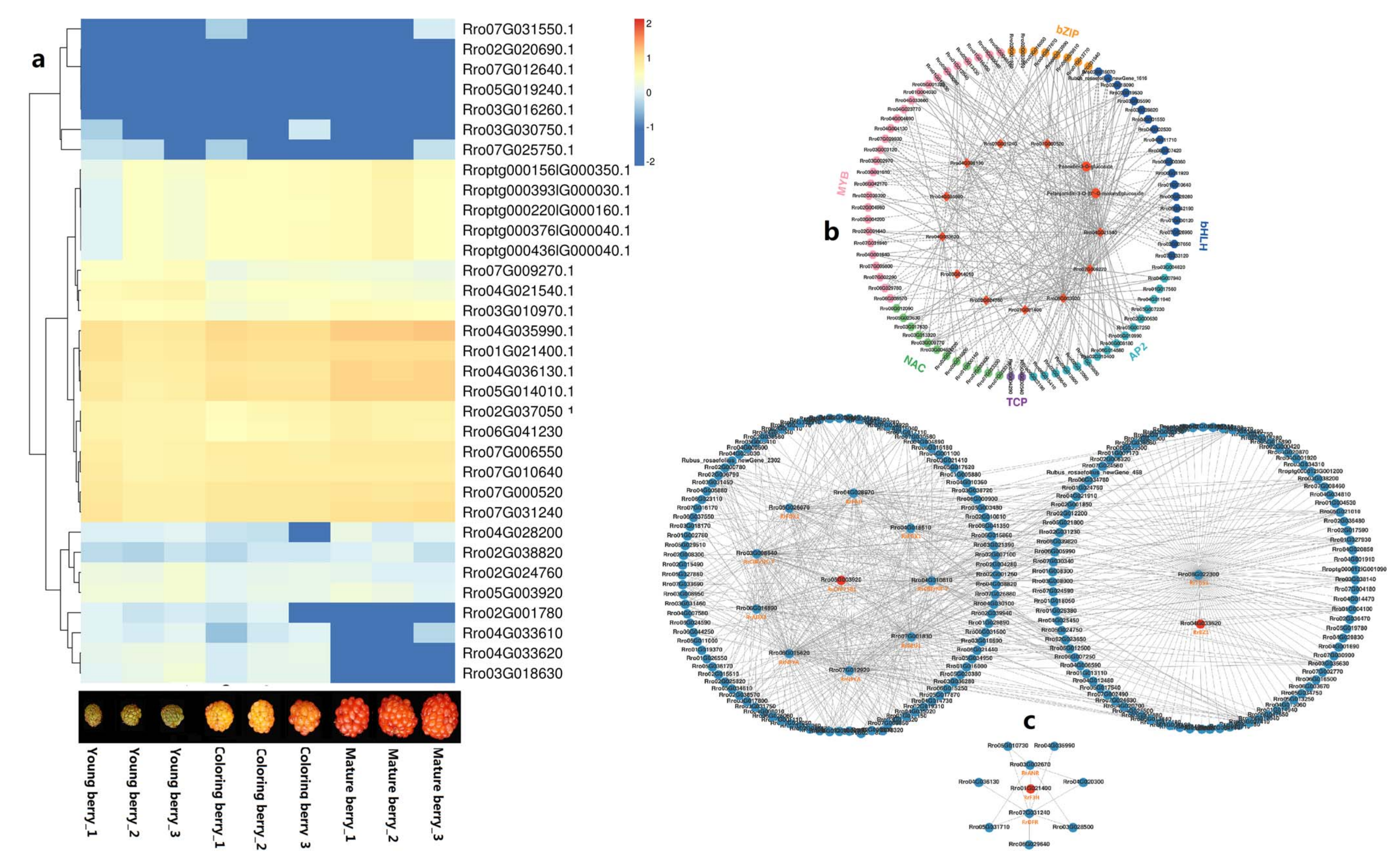 為了探索空心藨紅漿果中花青素生物合成調(diào)控的分子機制,該研究對空心藨紅漿果幼齡期和成熟期的轉(zhuǎn)錄組和代謝組進行了相關性分析。在成熟漿果中發(fā)現(xiàn)的主要花青素——芍藥苷-3-O-葡萄糖苷和芍藥苷-3-O-(6’’-O-丙二酰基)葡萄糖苷被鑒定為顯著差異積累代謝產(chǎn)物(DAMs),其中11個結構基因被發(fā)現(xiàn)為差異表達基因(DEGs)。其中,Rro07G000520.1 (RrBZ1)、rro07g035990.1和rro07g036130.1 (RrCHS)、rro07g06550.1 (RrCHI)、rro07g021400.1 (RrF3H)、Rro07G031240.1 (RrDFR)和Rro05G014010.1 (RrANS)與芍藥苷-3-O-葡萄糖苷積累呈正相關,而Rro07g033620.1、Rro07g024760.1 (RrBZ1)、Rro07G009270.1 (RrUGT75C1)、Rro04G021540.1 (RrUGT79B1)與這兩種物質(zhì)呈負相關(圖6b)。編碼屬于MYB、bHLH、AP2、bZIP、NAC和TCP家族轉(zhuǎn)錄因子的幾個DEGs的表達與上述一個或多個結構基因和兩個DEGs呈顯著正相關或負相關(圖6b)。這些發(fā)現(xiàn)表明轉(zhuǎn)錄因子廣泛參與了空心藨花青素生物合成的調(diào)控。通過蛋白-蛋白相互作用(PPI)分析,該研究發(fā)現(xiàn)Rro4G033620蛋白(RrBZ1)與三甲基鳥苷合成酶1 (RrTGS1)直接相互作用,Rro5G003920蛋白(RrBZ1)直接與鐵氧還蛋白C1 (RrFDX1)、CCAAT結合轉(zhuǎn)錄因子(RrNFYA)、谷氨酸合成酶1 (RrGLU1)和組蛋白樣轉(zhuǎn)錄因子(RrCBF/NF-Y)相互作用,Rro1G021400蛋白(RrF3H)直接與RrFDR和RrANR相互作用(圖6c)。上述結果表明,空心藨花青素的合成受RNA甲基化、結構基因編碼蛋白和轉(zhuǎn)錄因子的相互作用調(diào)控。