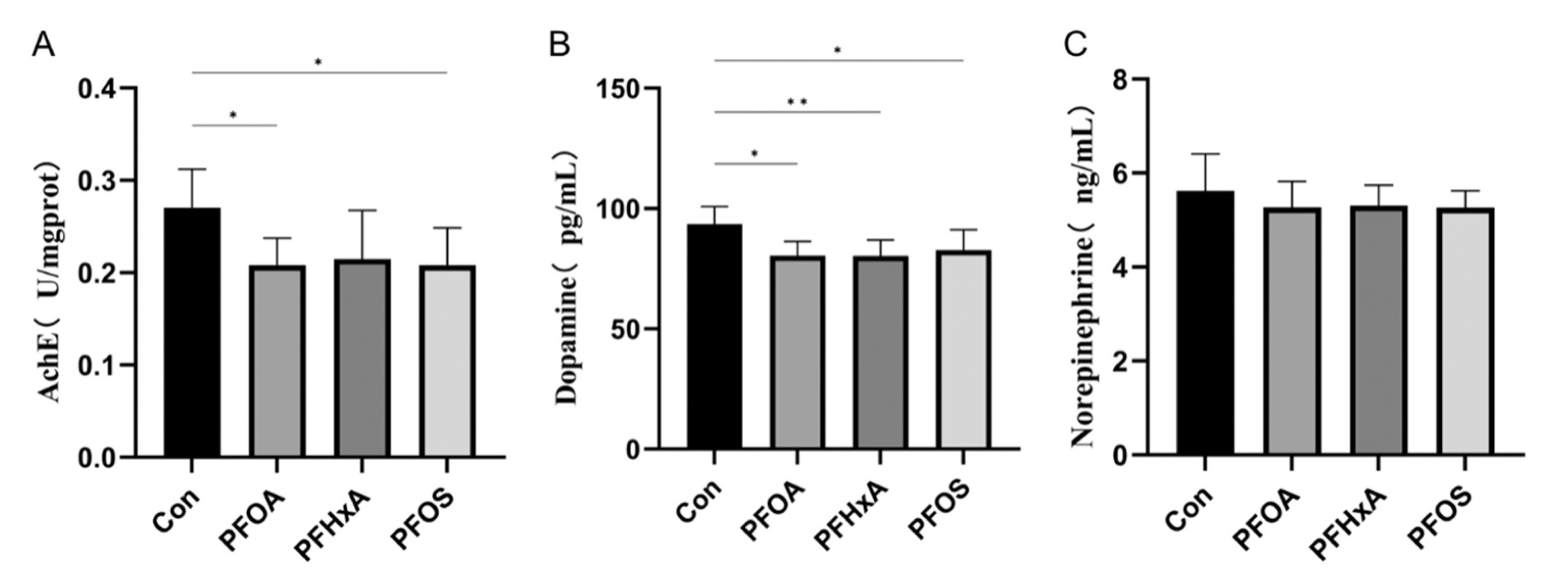 研究了PFAS對鯽魚腦組織乙酰膽堿酯酶和神經遞質活性的影響。與Con組相比,PFOA和PFOS組腦內乙酰膽堿酯酶活性顯著降低。此外,PFOA、PFHxA和PFOS組多巴胺(DA)水平顯著降低(圖2B)。然而,去甲腎上腺素(NE)水平在實驗魚組之間沒有顯著變化(圖2C)。這些結果表明,PFAS暴露抑制了魚腦中的AChE和神經遞質水平,并影響了整體腦功能。