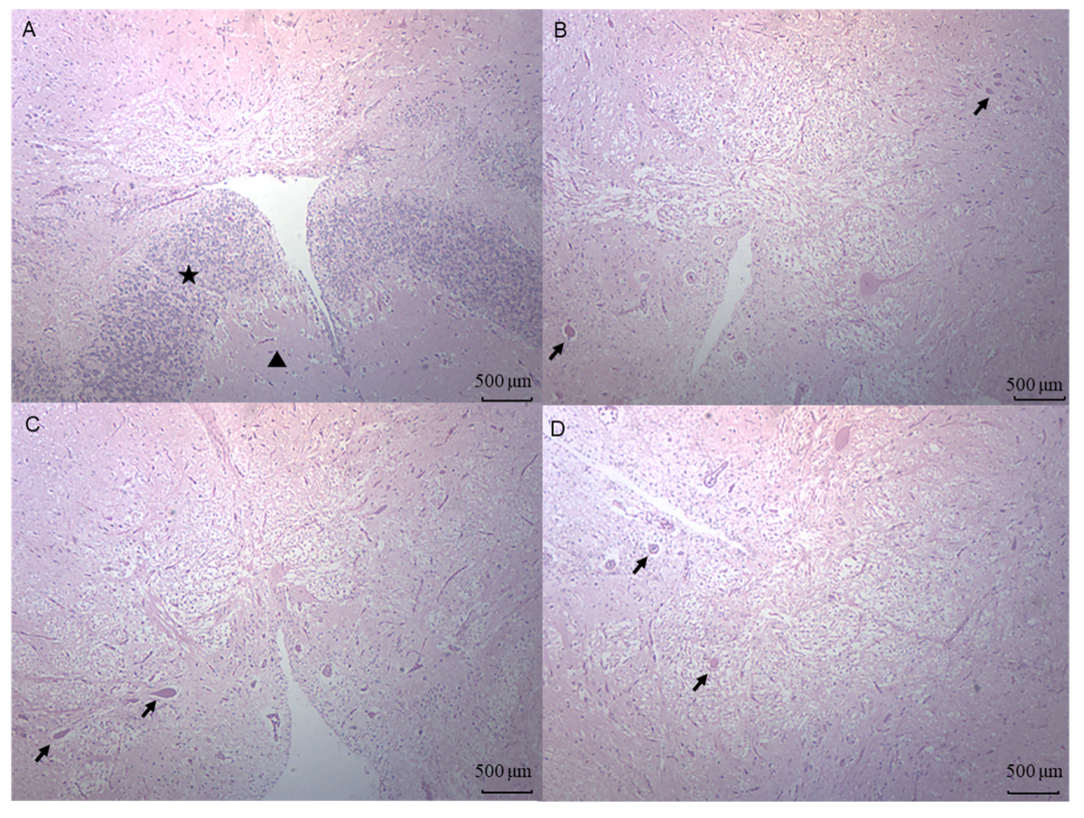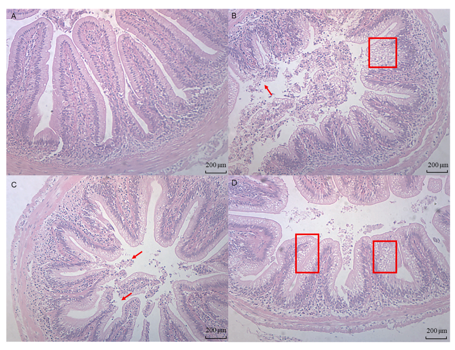 組織病理學染色分析各暴露組腦、腸基本變化。Con組腦組織組織結構正常,包括正常的浦肯野細胞層和分子層(圖3A)。pfas治療組神經周圍明顯空泡化。此外,PFHxA和PFOS組可見廣泛的多灶性脫鞘(圖3B和C)。在PFOA組,充血血管壁透明化,靠近收縮的神經元,神經周圍形成空泡(圖3D)。Con組鯽魚腸黏膜形態(tài)結構完整,腸黏膜上皮細胞細胞核排列緊密整齊,無損傷跡象(圖4A)。在每個pfas處理組中,絨毛膜絨毛的長度顯著減少,并與一定程度的損傷有關。PFHxA和PFOS組觀察到上皮粘膜破裂(圖4B和C), PFHxA和PFOA組腸絨毛萎縮、空泡化、細胞核紊亂(圖4B和D)。H&E染色結果表明,PFAS暴露對鯽魚腸道和腦組織造成損傷。