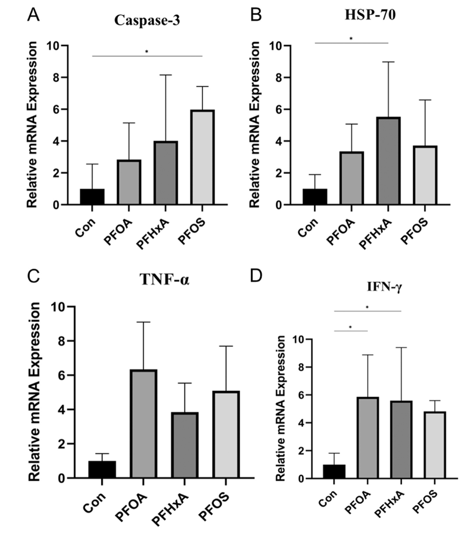 PFOS組與Con組相比,應激相關基因caspase-3的表達顯著升高(圖5A)。同樣,在PFHxA組中,HSP-70的表達顯著增加(圖5B)。此外,促炎細胞因子INF-γ在PFOA和PFHxA組中的表達水平顯著升高(圖5D),而TNF-α的表達在兩組間無顯著差異(圖5C)。