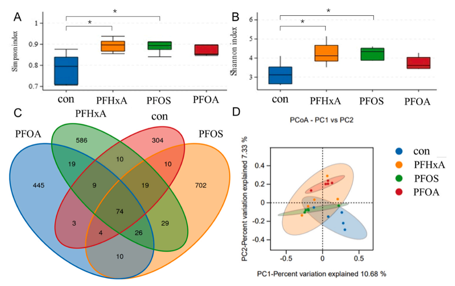 與Con組相比,PFHxA和PFOS組細菌群落的Simpson和Shannon指數明顯高于Con組(圖6A和B),表明細菌物種多樣性有所增加?;贠TU的venn圖分析(圖6C),四組之間重疊OTUs數量相對較少(不超過100個),各組特有的OTUs相對較多(均超過300個)。圖6D清楚地顯示了Con組與其他三組在微生物群方面的顯著差異,表明PFAS暴露引起了鯽魚腸道微生物群組成的變化。