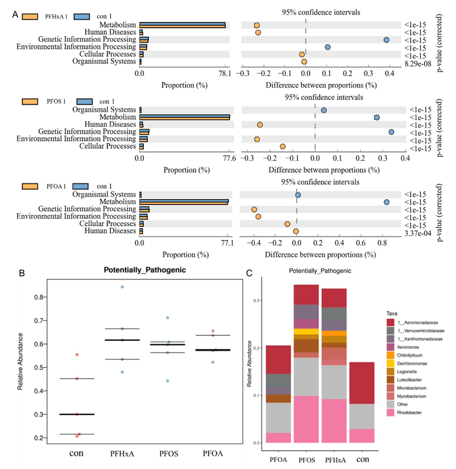 根據PICRUSt2,根據特征序列預測整個群落的通路變化,并進行功能基因差異分析。與Con組相比,所有三個PFAS治療組都顯著改善了人類疾病中涉及的細胞過程和信號通路(圖8A)。利用BugBase對表型分類進行預測。與Con組相比,每個PFAS治療組顯著增加了微生物群的潛在致病性(圖8B)。在屬水平上,與Con組相比,各PFAS處理組增加了Luteolibacter的相對豐度,PFOS和PFHxA組增加了RhodobacterLegionella的相對豐度,PFOS組增加了decchloromonasAeromonas的相對豐度(圖8C)。這些結果表明,PFAS可能導致鯽魚腸道菌群的潛在致病性增加。