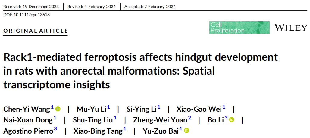2024年7月,中國醫(yī)科大學(xué)盛京醫(yī)院在國際學(xué)術(shù)期刊cell proliferation發(fā)表一項(xiàng)重要研究成果,題為:Rack1‐mediated ferroptosis affects hindgut development in rats with anorectal malformations: Spatial transcriptome insights。使用空間轉(zhuǎn)錄組測序、免疫熒光、CCK-8、WB、ROS檢測等來剖析直腸肛門畸形的發(fā)育機(jī)制。