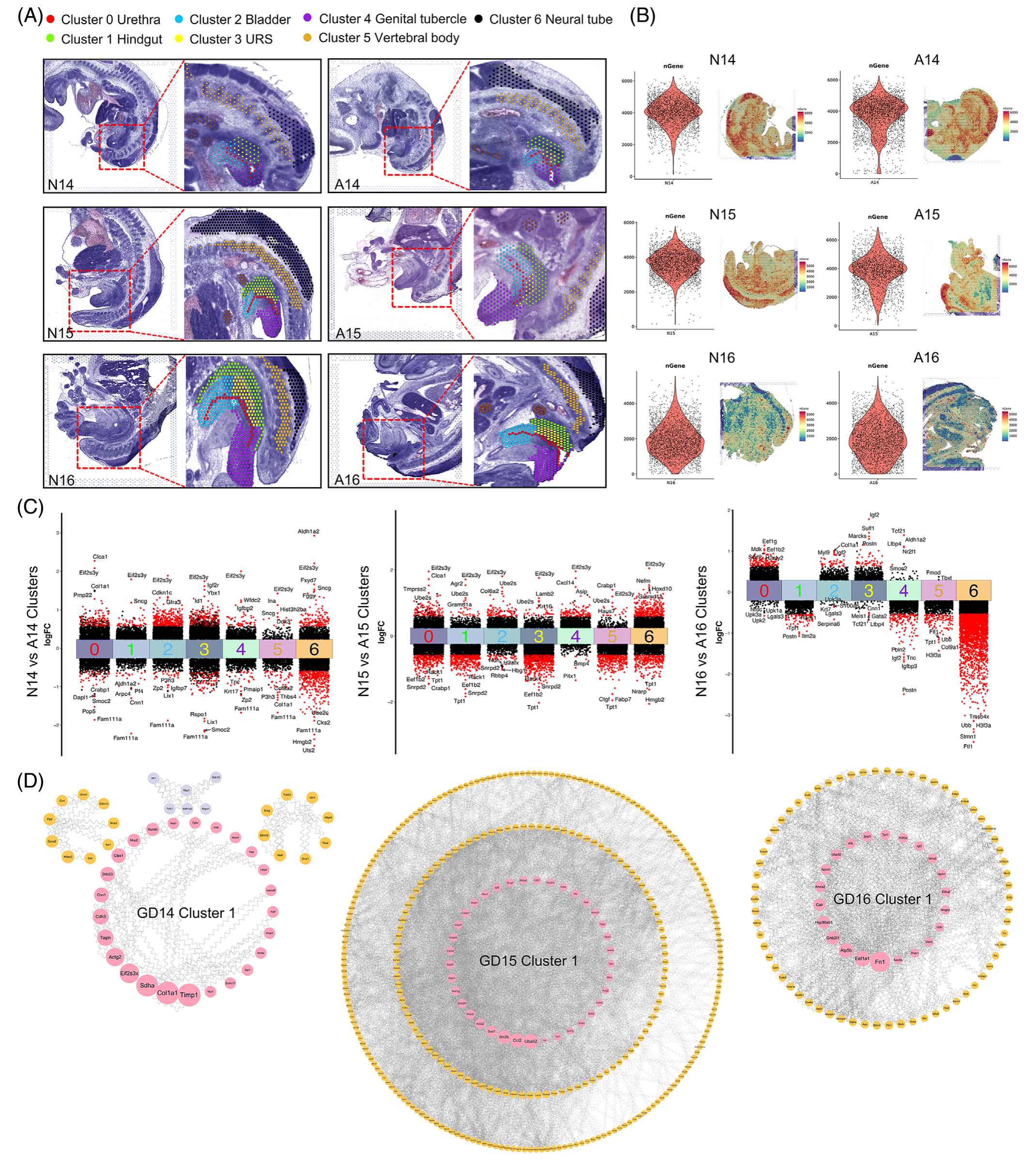 在這項(xiàng)研究中,作者在 GDs 14-16 (稱為 N14-16) 上使用正常的 Wistar 大鼠胚胎,在 GDs 14-16 (稱為 A14-16) 上使用 ETU 誘導(dǎo)的 ARM 胚胎進(jìn)行空間轉(zhuǎn)錄組測序。制備大鼠胚胎的 6 個冷凍中矢狀切片,每個 10 μm 厚。這些切片包括尿道和后腸層,提供了特定時間點(diǎn)泄殖腔發(fā)育的全面視圖(圖 1A)。使用 10× Genomics Visium 空間轉(zhuǎn)錄組技術(shù),然后進(jìn)行組織透化、cDNA 合成和文庫構(gòu)建,作者成功地捕獲了正常和 ARM 胚胎中的視覺基因轉(zhuǎn)錄數(shù)據(jù),主要來自泄殖腔區(qū)域。為了確保來自同一區(qū)域的各種切片樣本之間的可比性和一致性,作者進(jìn)行了聚類注釋,產(chǎn)生了七個不同的聚類。這些集群包括泄殖腔區(qū)域內(nèi)的五個特定區(qū)域(集群 0-4),即尿道、后腸、膀胱、URS 和生殖器結(jié)節(jié)。此外,兩個簇 (簇 5 和 6) 對應(yīng)于椎體和神經(jīng)管區(qū)域 (圖 1A)。平均而言,每個解剖區(qū)域覆蓋 3005 個點(diǎn),每個點(diǎn)捕獲 16,905 個基因(圖 1B)。