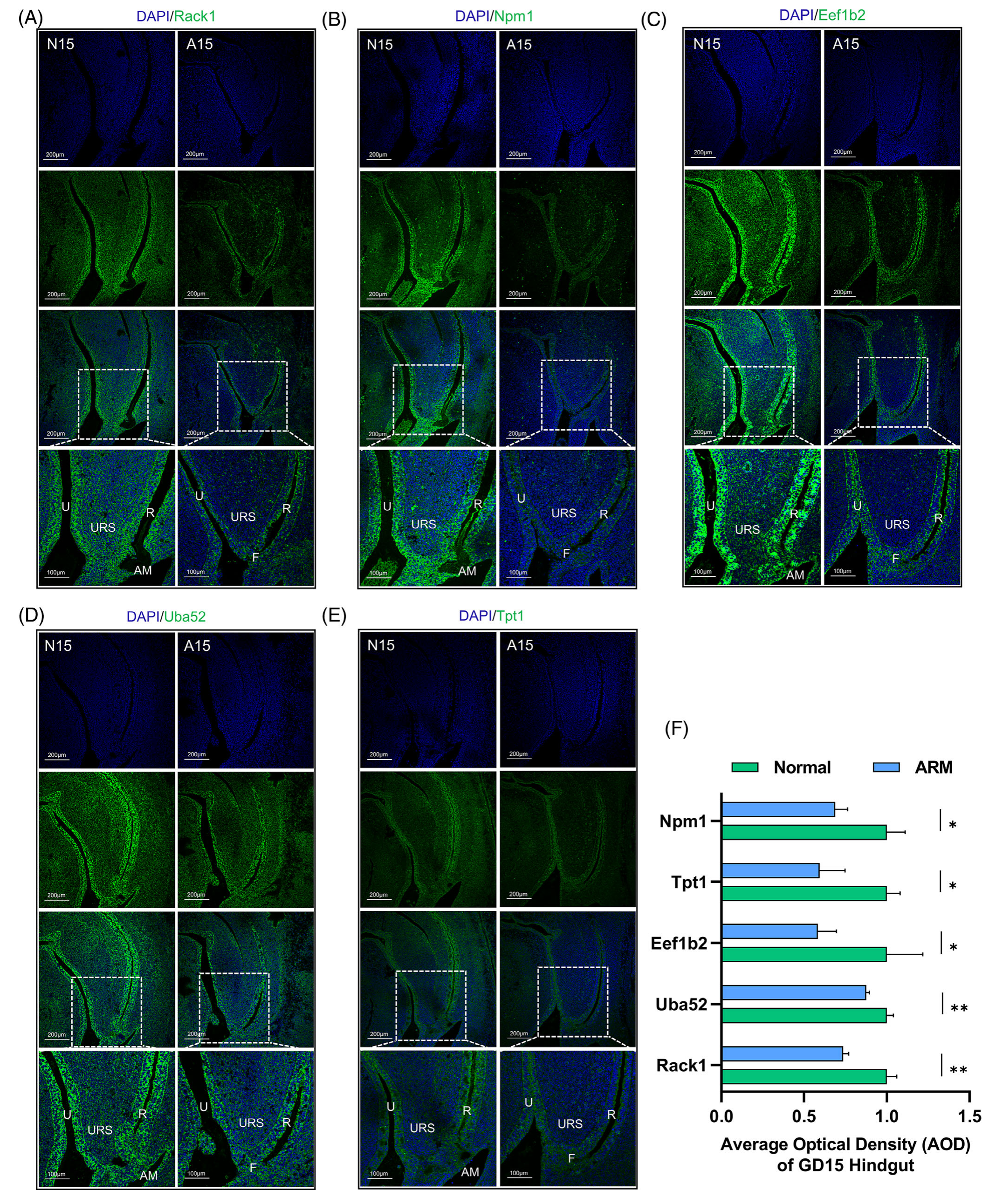 圖 2A-E 全面說明了 GD15 截面泄殖腔區(qū)域中前五個基因的蛋白質(zhì)表達(dá)模式和定位:Rack1、Npm1、Eef1b2、Uba52?和?Tpt1。這些數(shù)字是使用免疫熒光染色獲得的。值得注意的是,這 5 種蛋白質(zhì)在 N15 泄殖腔區(qū)域的尿道和后腸上皮內(nèi)均表現(xiàn)出位點(diǎn)特異性表達(dá)。除?Tpt1?外,其他 4 種蛋白在 AM 區(qū)域內(nèi)表現(xiàn)出表達(dá)水平升高。此外,觀察到這些蛋白質(zhì)離散分布在 URS 的下肢和后腸的間質(zhì)附近。相比之下,這五種蛋白的表達(dá)在 A15 泄殖腔區(qū)域的尿道和后腸上皮內(nèi)明顯下降,伴隨著尿道直瘺部位的表達(dá)水平降低 (p < 0.05)。圖 2F 顯示了平均光密度 (AOD) 的半定量評估,特別是在后腸結(jié)構(gòu)域內(nèi)。