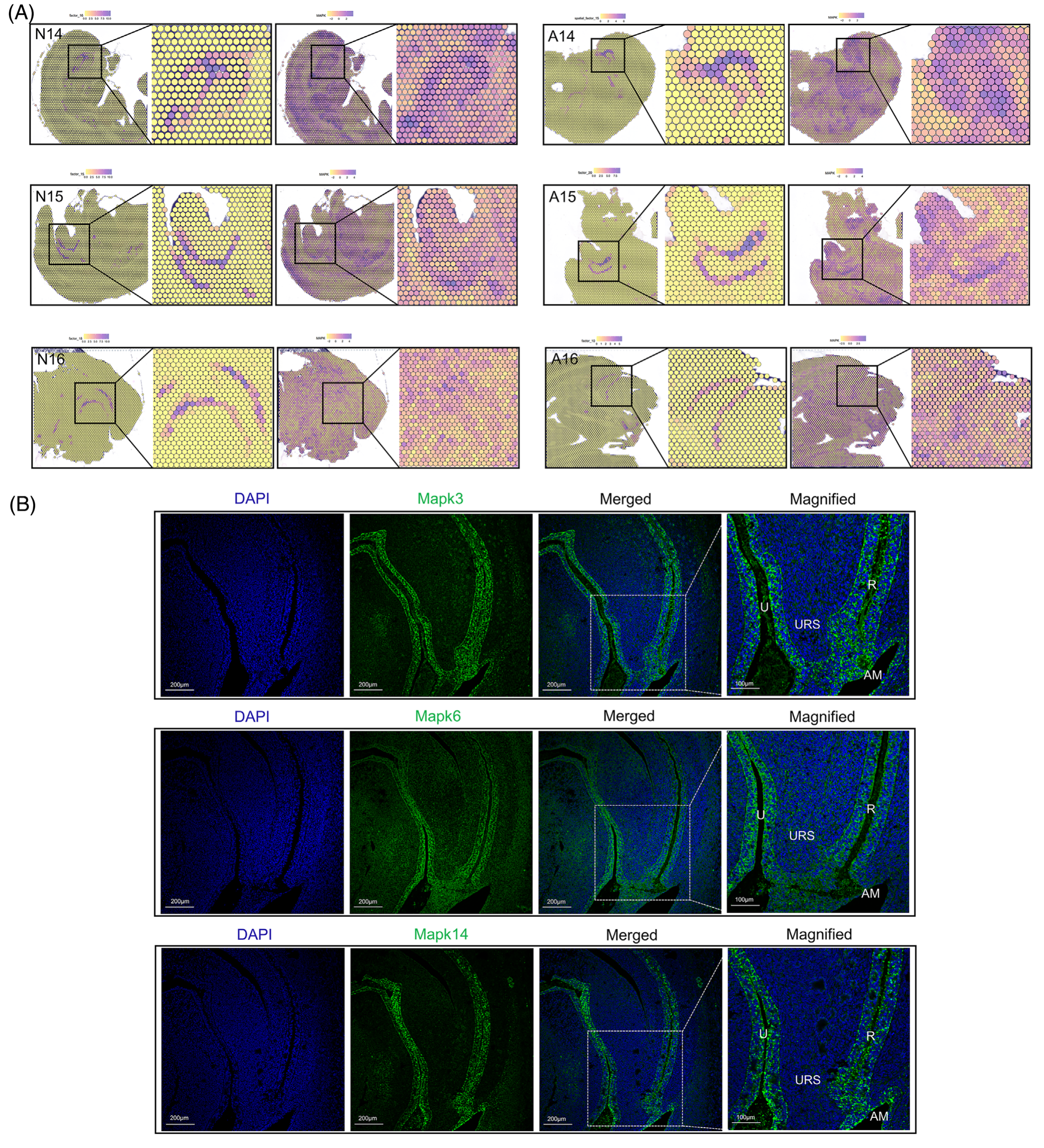 PROGENy 算法用于通過下游基因表達(dá)的變化評估信號通路的活性。作者獲得了正常組和 ARM 組 GDs 14-16 樣本中不同通路的活性水平評分。在使用 NNMF 對后腸區(qū)域(N14 因子 16、A14 因子 15、N15 因子 15、A15 因子 20、N16 因子 18 和 A16 因子 10)進(jìn)行聚類分析中,PROGENy 算法顯示與 MAPK 信號通路呈強(qiáng)正相關(guān),表明 MAPK 信號在后腸中顯著富集(圖 3A)。從這些區(qū)域提取來自 Erk、P38、JNK 和 Erk5 家族的 12 個成員分子的定位表達(dá)模式。具體來說,Mapk3 、 Mapk6 和 Mapk14 主要富集在泄殖腔區(qū)域。這些蛋白質(zhì)的免疫熒光驗(yàn)證證實(shí)了它們在尿道和后腸區(qū)域的特異性表達(dá),在 URS 和間質(zhì)區(qū)域的表達(dá)相對較弱,這與 PROGENy 預(yù)測一致(圖 3B)。