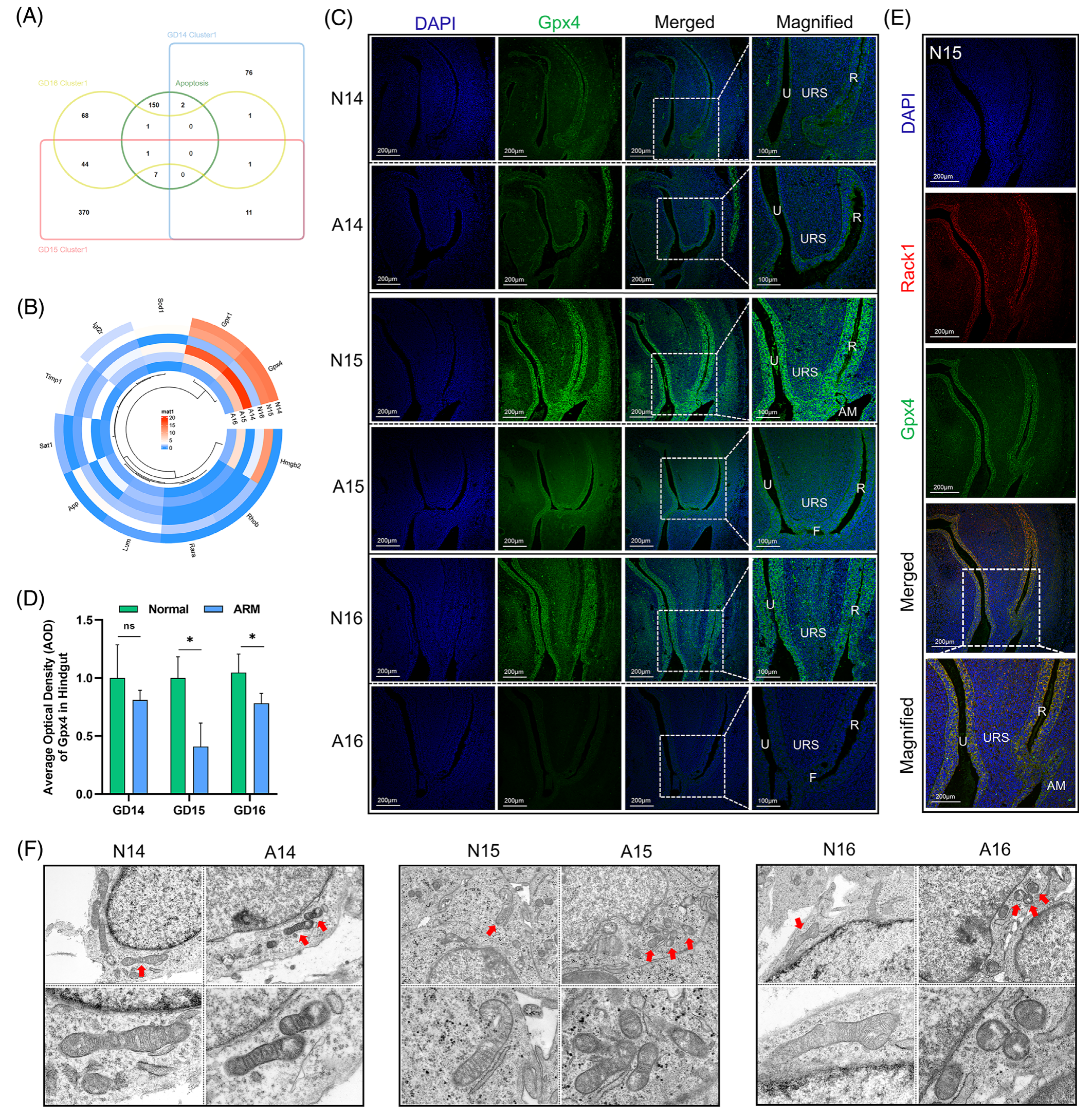 在基因集富集分析(GSEA)數(shù)據(jù)庫中,細(xì)胞死亡基因集包含161個基因,其中 7 個細(xì)胞死亡相關(guān)基因是從基因集與GD 15上簇1中的 DEGs 交集中獲得的(圖 4A)。圓形熱圖顯示了與聚類1的6個樣本相同區(qū)域內(nèi)的細(xì)胞死亡基因的表達(dá)譜。值得注意的是,發(fā)現(xiàn)谷胱甘肽過氧化物酶家族的關(guān)鍵成員?Gpx4?在 GD 15 的簇 1 中下調(diào)(p < 0.05;圖 4B)。免疫熒光染色顯示 Gpx4 蛋白在尿道和后腸上皮以及 AM 區(qū)域的顯著定位,在 URS 中觀察到的分布相對較淺。在 ARM 組的泄殖腔中觀察到 Gpx4 陽性信號的減少(圖 4C)。AOD 分析表明,在 GDs 15 和 16 上,后腸中 Gpx4 表達(dá)在統(tǒng)計(jì)學(xué)上顯著降低(p < 0.05;圖 4D)。