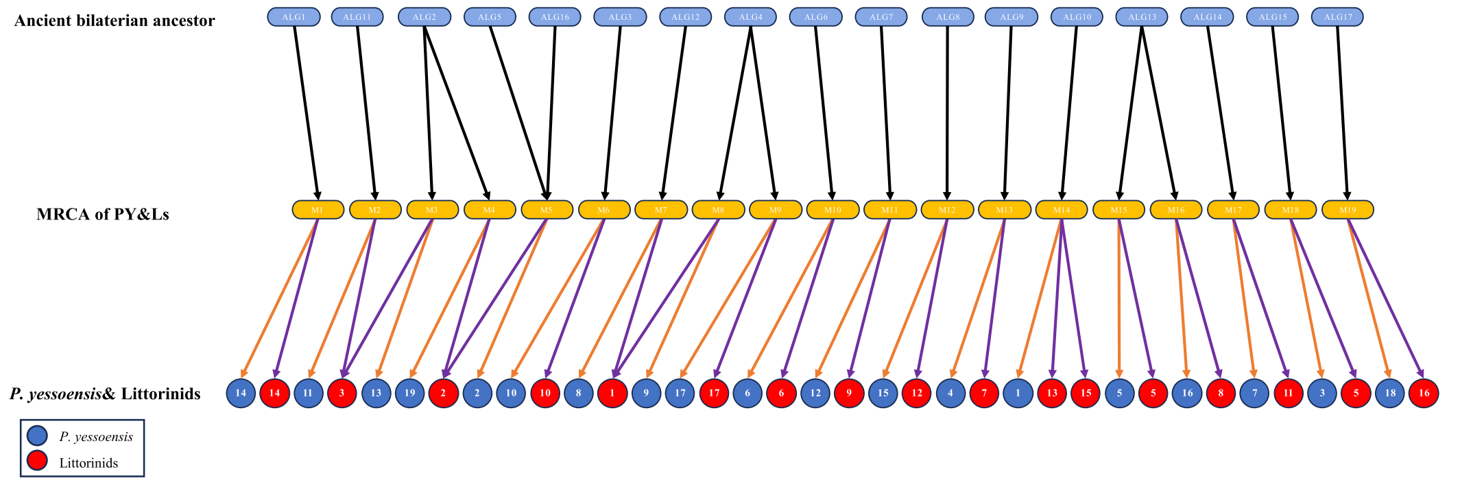 圖3-簡(jiǎn)約核型演化歷程推演及濱螺和扇貝共同祖先(MRCA of PY &Ls)核型構(gòu)建