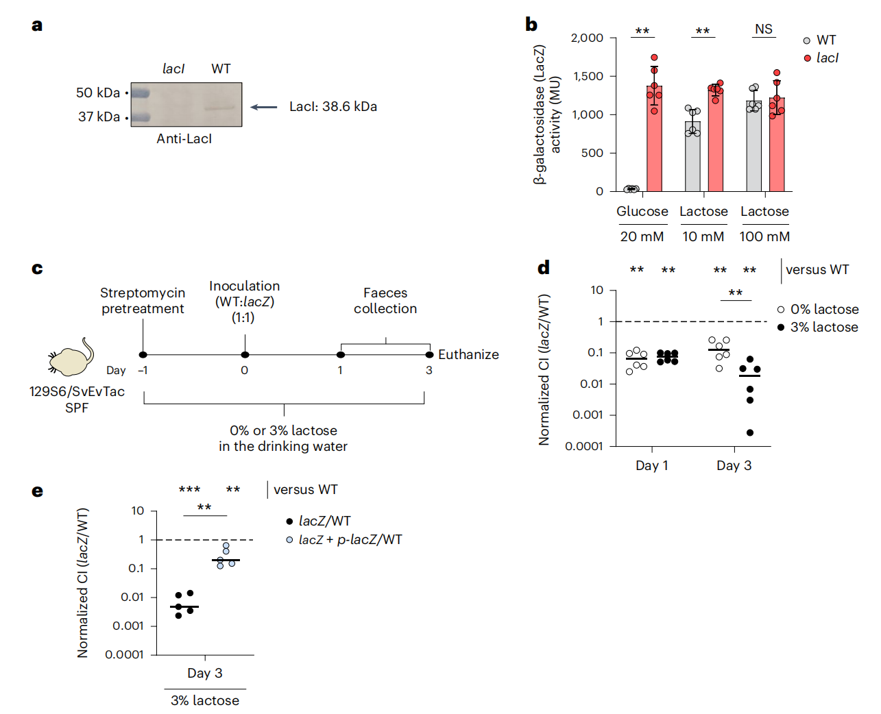 研究人員使用小鼠模型,比較了野生型大腸桿菌 8178 菌株和 lacZ 突變體菌株在富含乳糖條件下的生長情況。結(jié)果顯示,野生型菌株的生長速度更快,這表明 lacZYA 操縱子在腸道定植中起著重要作用。lacZYA 操縱子負(fù)責(zé)乳糖的代謝,野生型菌株能夠更有效地利用乳糖,從而獲得競爭優(yōu)勢。