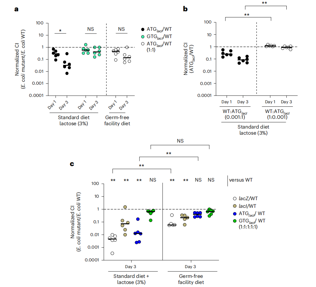 2024年8月19日,瑞士蘇黎世聯(lián)邦理工學(xué)院Wolf-Dietrich Hard團(tuán)隊(duì)在Nature microbiology期刊發(fā)表題為“Non-canonical start codons confer context-dependent advantages incarbohydrate utilization for commensal E. coli?in the murine gut”的論文,研究者分析了小鼠腸道共生大腸桿菌 8178 中的乳糖利用操縱子,發(fā)現(xiàn)乳糖利用相關(guān)的 lacI 基因的起始密碼子并非經(jīng)典的 ATG,而是 GTG,增強(qiáng)了其對乳糖的利用能力,揭示了非經(jīng)典起始密碼子在代謝競爭中的重要功能。