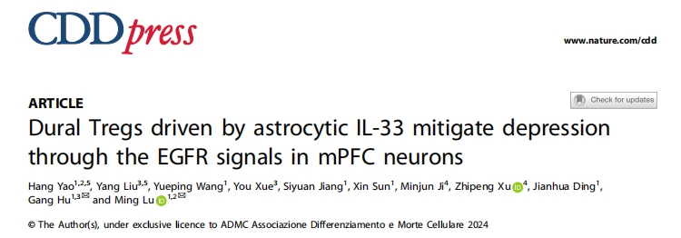 2024年11月,南京醫(yī)科大學(xué)基礎(chǔ)醫(yī)學(xué)院藥理學(xué)系魯明教授、胡剛教授團(tuán)隊(duì)在Cell Death & Differentiation發(fā)表題為”Dural Tregs Driven by Astrocytic IL-33 Mitigate Depression Through the EGFR Signals in mPFC Neurons”的研究論文,使用單細(xì)胞轉(zhuǎn)錄組測(cè)序技術(shù)等多種技術(shù),深入闡述小鼠硬腦膜免疫細(xì)胞的抗抑郁機(jī)制,為抑郁癥治療提供了新的潛在治療靶點(diǎn)。接下來是本文的詳細(xì)解讀。