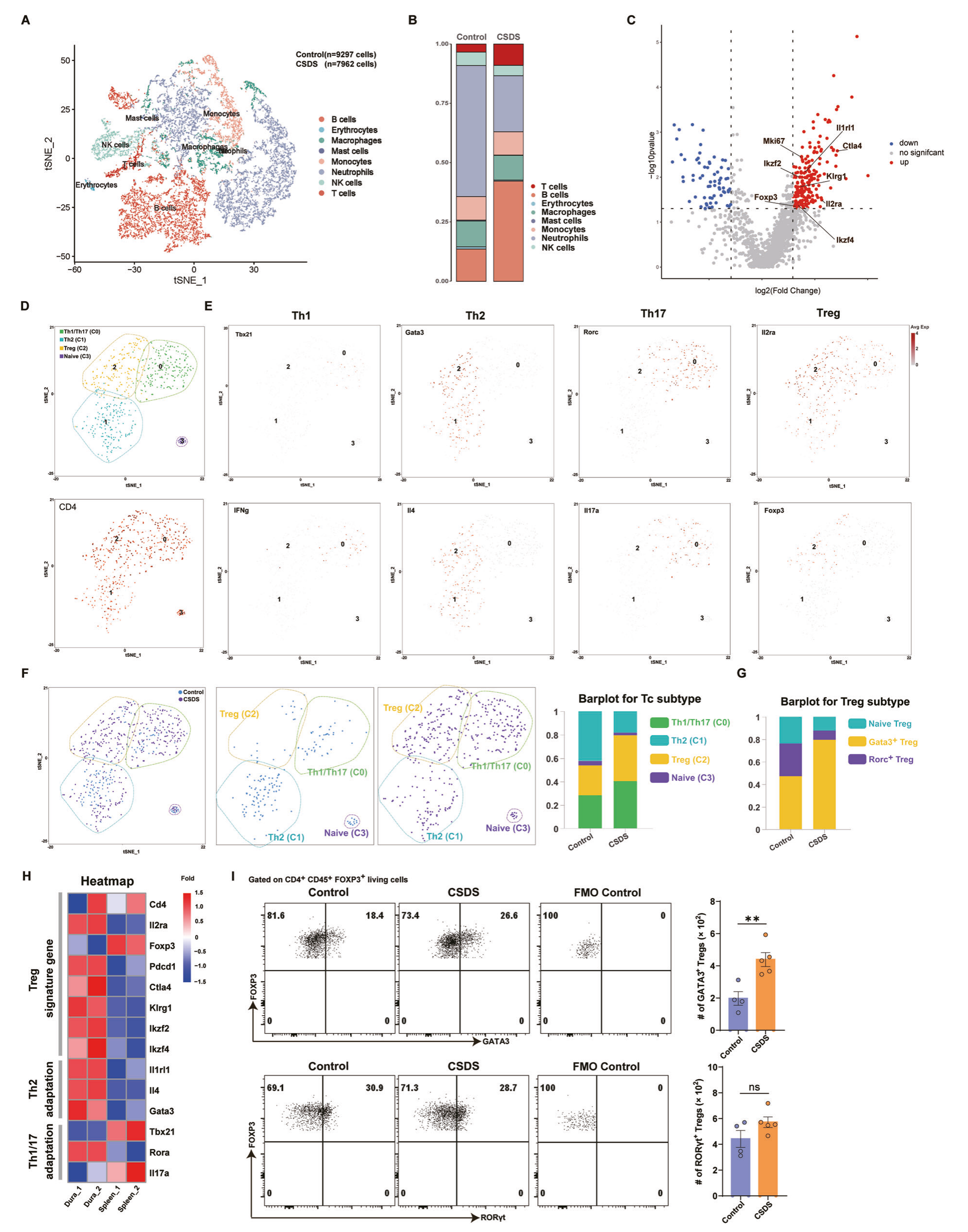 CSDS小鼠和對(duì)照組小鼠硬腦膜分選得到的免疫細(xì)胞進(jìn)行scRNA-seq,結(jié)果顯示CSDS小鼠硬腦膜T細(xì)胞占比增加,其中Treg和Th17比例增加,Th2比例降低,初始T細(xì)胞沒有發(fā)生變化;Treg中,Gata3+?Treg比例提高,初始Treg和Rorx+?Treg比例降低。對(duì)照組小鼠硬腦膜和脾臟分選得到Treg進(jìn)行SMART-seq,發(fā)現(xiàn)與脾臟相比,硬腦膜Treg的Gata3+亞型和Rora+亞型相關(guān)基因表達(dá)上調(diào)。流式細(xì)胞術(shù)進(jìn)一步證實(shí)CSDS小鼠硬腦膜中GATA3+?Treg顯著增加,RORγt+?Treg數(shù)量無顯著變化。這些表明GATA3+ Treg可能參與抑郁表現(xiàn)的調(diào)控。