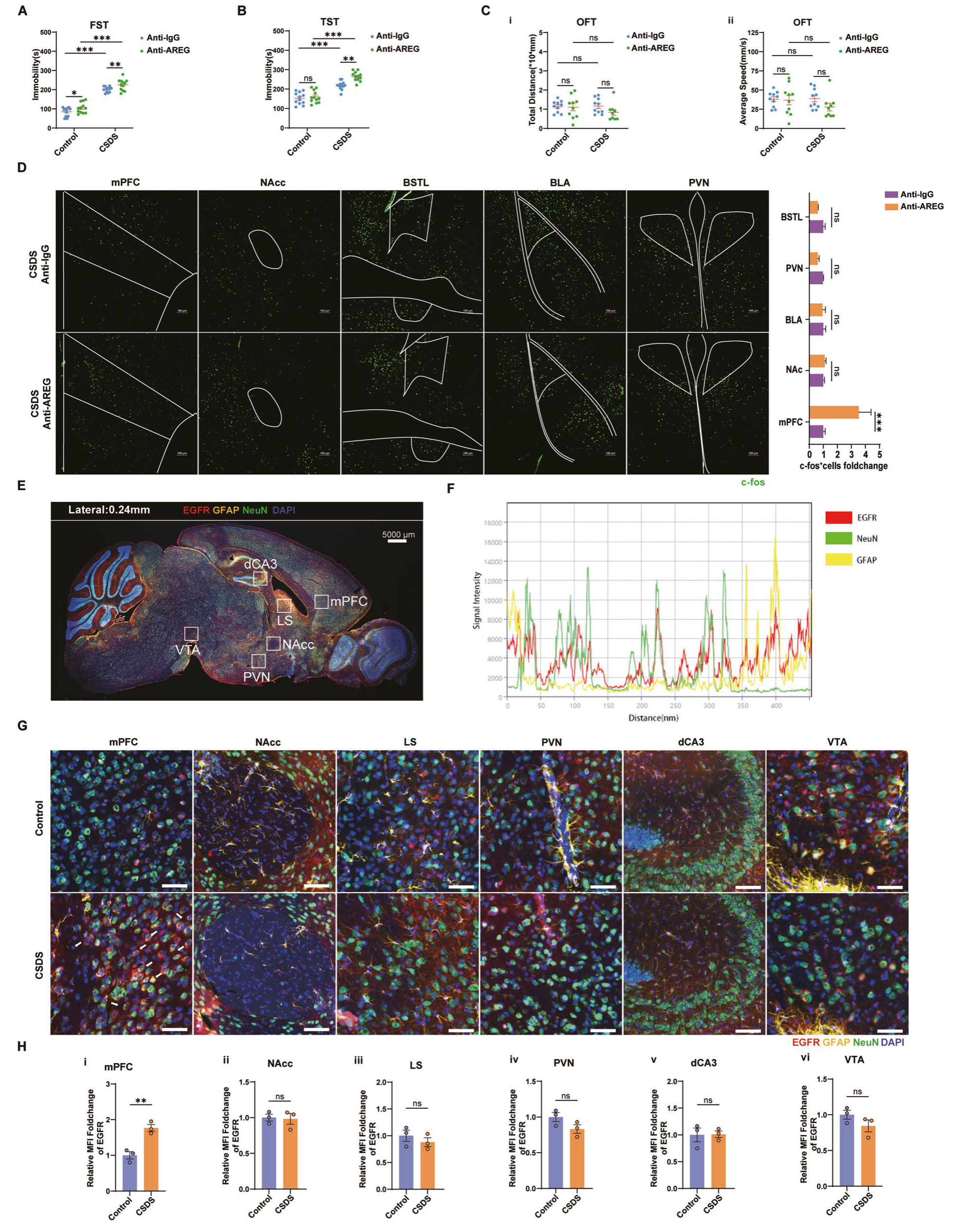 腦免疫熒光掃描結(jié)果表明硬腦膜來源的AREG可能特異性的影響mPFC神經(jīng)元活性,TSA多重染色等實(shí)驗(yàn)結(jié)果表明,CSDS應(yīng)激顯著誘導(dǎo)mPFC神經(jīng)元EGFR(AREG是EGFR配體)的表達(dá),硬腦膜AREG去除可顯著抑制mPFC的EGFR激活,小腦延髓池注射的AREG中和抗體只去除了硬腦膜AREG但對(duì)mPFC腦區(qū)AREG無顯著影響。通過這些結(jié)果,研究者假設(shè)神經(jīng)元表達(dá)EGFR可以接收硬腦膜Treg來源的AREG,并激活EGFR信號(hào),直接影響神經(jīng)元活性。