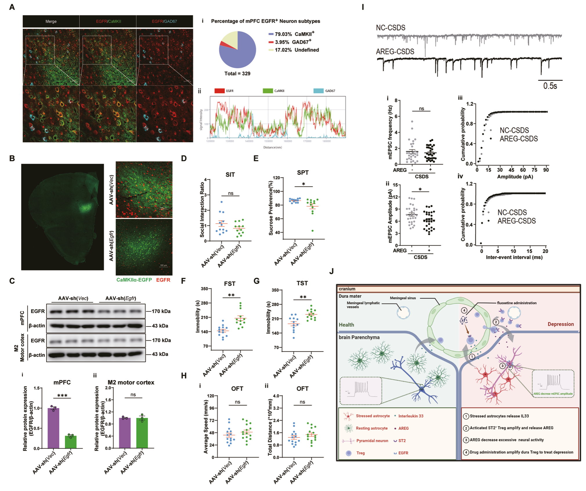 為了驗(yàn)證這一假設(shè),研究者使用AAV抑制mPFC錐體神經(jīng)元EGFR的表達(dá),免疫熒光、Western blot等實(shí)驗(yàn)結(jié)果表明,敲除EGFR部分地加重CSDS小鼠抑郁表現(xiàn),應(yīng)激誘導(dǎo)的抑郁中mPFC神經(jīng)元EGFR信號(hào)起到重要作用,揭示mPFC錐體神經(jīng)元是硬腦膜Treg來源AREG的靶細(xì)胞。