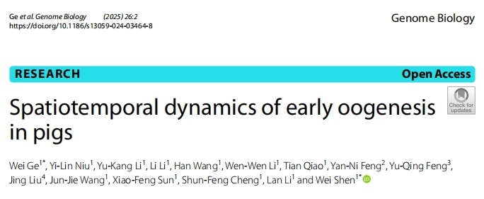 2025年1月,青島農(nóng)業(yè)大學(xué)葛偉教授與沈偉教授團隊在學(xué)術(shù)期刊《Genome Biology》上發(fā)表了一篇題為《Spatiotemporal dynamics of early oogenesis in pigs》的研究論文。該研究利用了單細胞RNA測序和空間轉(zhuǎn)錄組技術(shù),解析了豬早期卵子發(fā)生中的基因表達及空間組織特征。研究發(fā)現(xiàn),豬生殖細胞在卵巢中呈“皮質(zhì)到髓質(zhì)”分布,且與人類卵子發(fā)生過程相似,表明豬是研究人類卵子發(fā)生的良好模型。RNA速度分析揭示了顆粒細胞譜系特征,空間共定位分析和細胞通訊分析顯示皮質(zhì)與髓質(zhì)區(qū)域生殖細胞與體細胞通訊模式不同,特別是NOTCH信號通路和ECM蛋白在調(diào)控中起關(guān)鍵作用,強調(diào)了卵巢微環(huán)境對生殖細胞命運的重要性。
