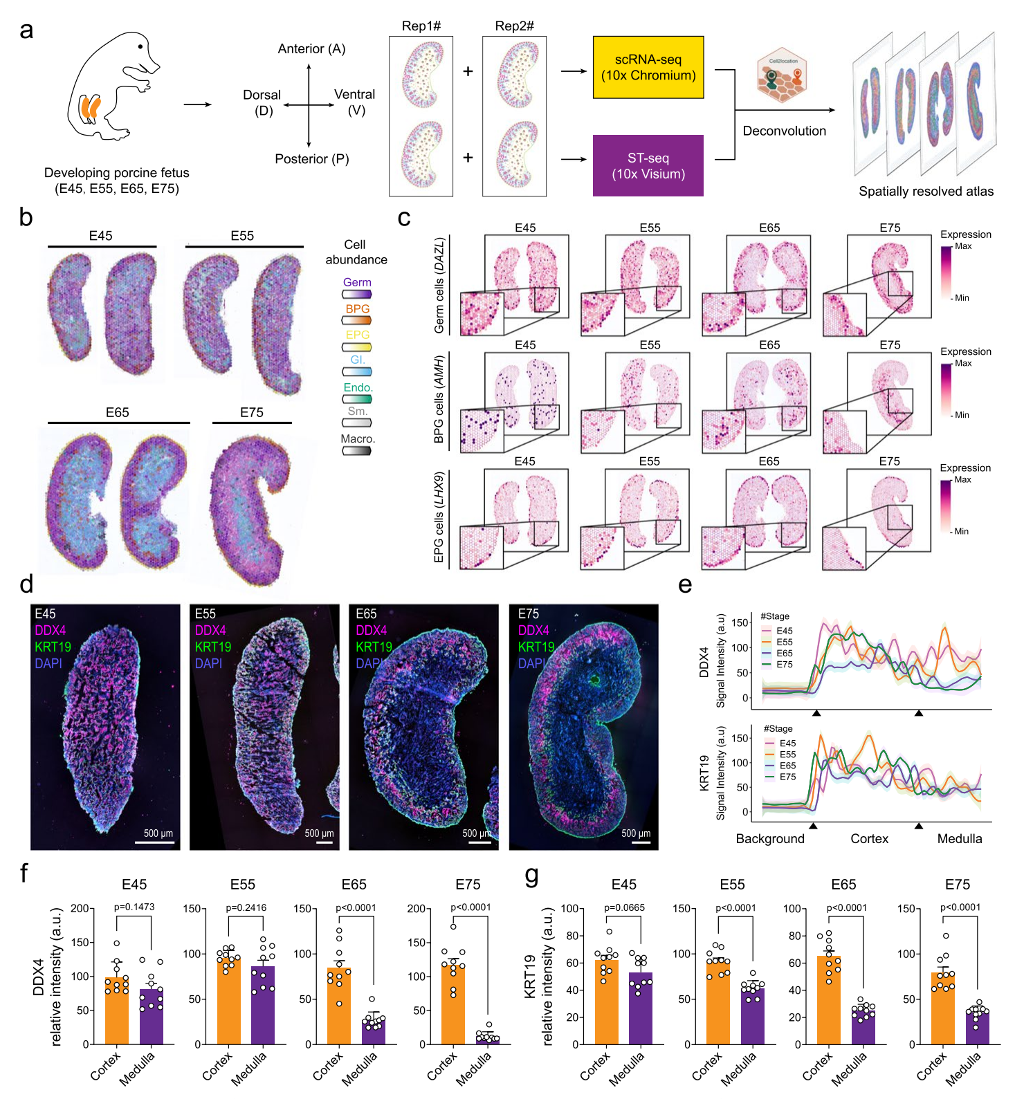 為進一步驗證分析結(jié)果,研究者進行了全組織染色實驗,使用生殖細胞標(biāo)志物DDX4和前顆粒細胞標(biāo)志物KRT19對E45至E75的胎兒卵巢進行染色,實驗結(jié)果與ST數(shù)據(jù)分析結(jié)果一致。此外,研究者還分析了這些陽性細胞在卵巢背腹軸上的空間分布,并通過熒光強度分析確認了生殖細胞和前顆粒細胞在皮層和髓質(zhì)區(qū)域的不同分布模式。這些發(fā)現(xiàn)為深入理解豬卵巢發(fā)育過程中細胞類型的空間動態(tài)變化提供了重要線索。