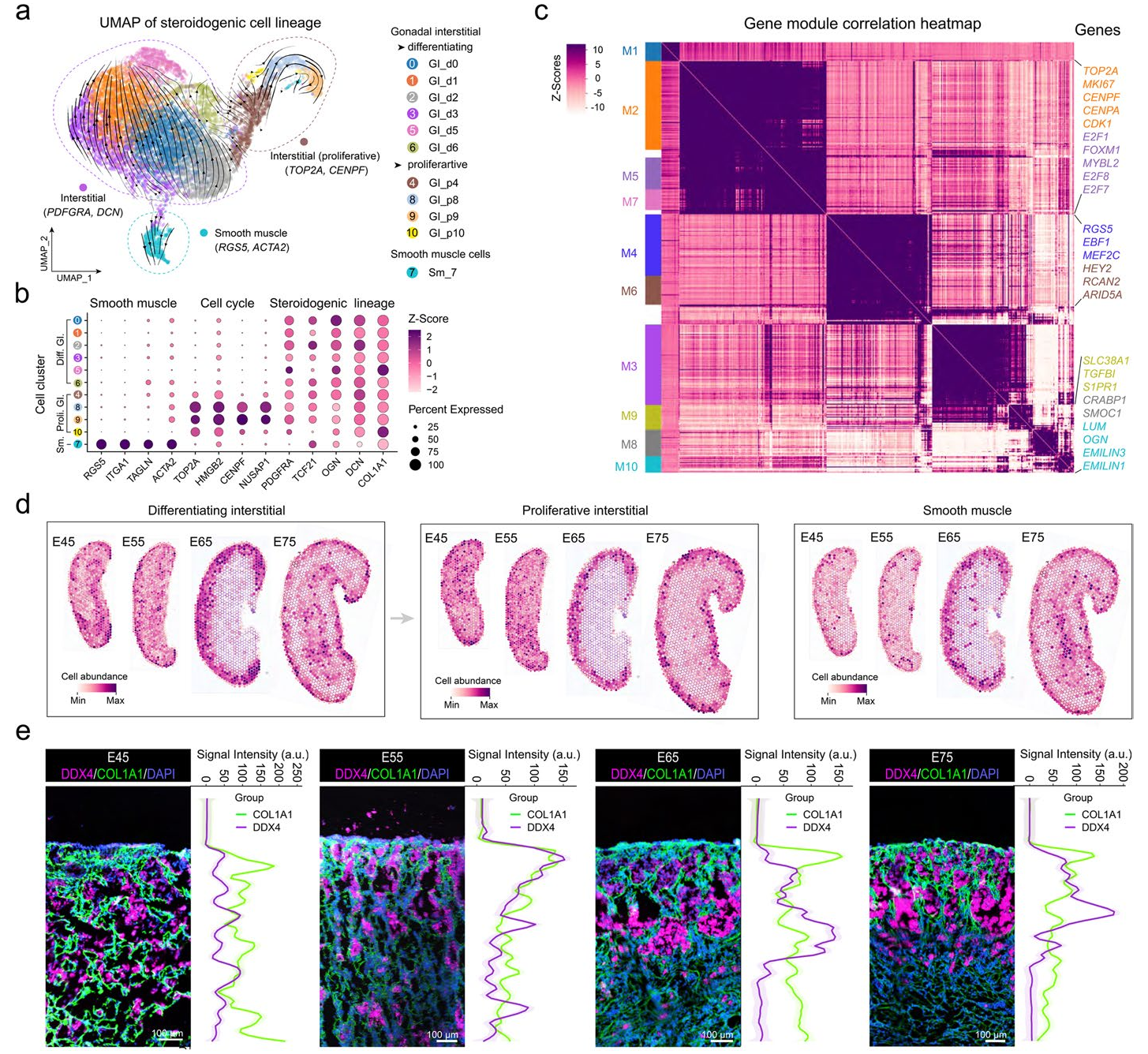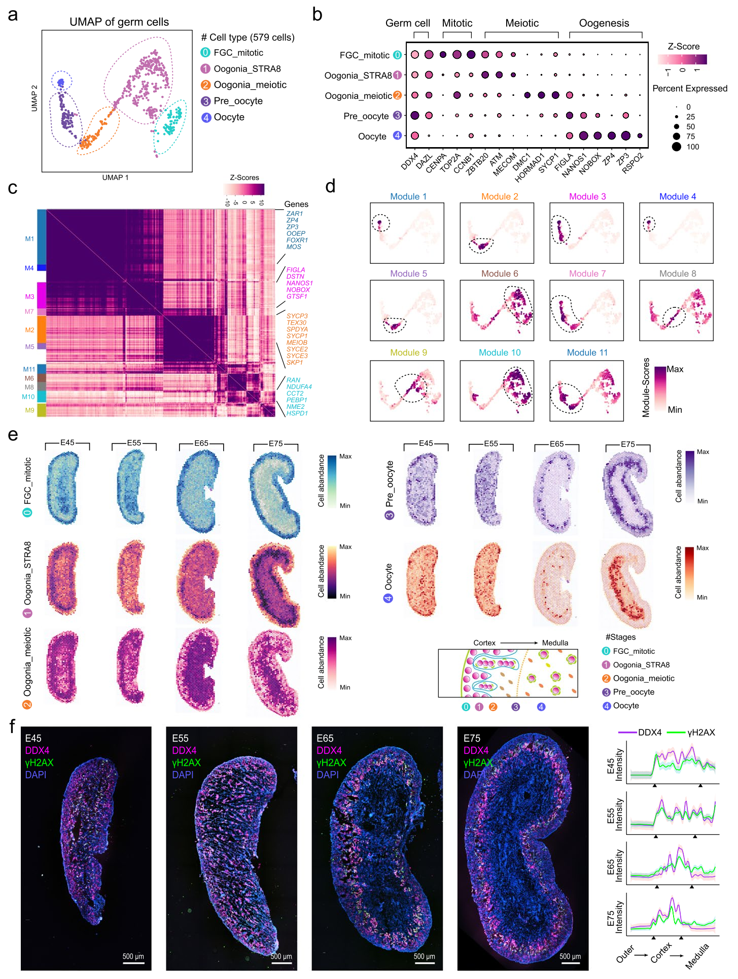 為了深入了解早期豬卵母細胞生成過程中模塊基因的功能富集情況,研究人員采用Hotspot算法,利用生殖細胞的scRNA-seq數(shù)據(jù)識別了相關(guān)基因模塊,共鑒定出11個功能各異的基因模塊。通過將單個模塊投影到UMAP圖中,確定了具有簇特異性的信息性基因模塊。剖析了早期豬卵母細胞生成過程中的基因表達譜后,研究人員進一步在空間環(huán)境中研究了這一過程。通過對ST芯片上的生殖細胞進行解卷積,揭示了早期卵母細胞生成的皮質(zhì)-髓質(zhì)梯度。為了驗證上述分析,研究人員使用生殖細胞標(biāo)記DDX4和減數(shù)分裂生殖細胞細線期標(biāo)記γH2AX進行了全組織染色實驗,以定位在不同階段啟動減數(shù)程序的生殖細胞。評估了C-M軸的熒光強度后發(fā)現(xiàn)在E45和E55卵巢中,γH2AX信號沿C-M軸的水平相似,而在E65至E75卵巢中,γH2AX信號在內(nèi)皮層達到峰值,在髓質(zhì)區(qū)域則減少。