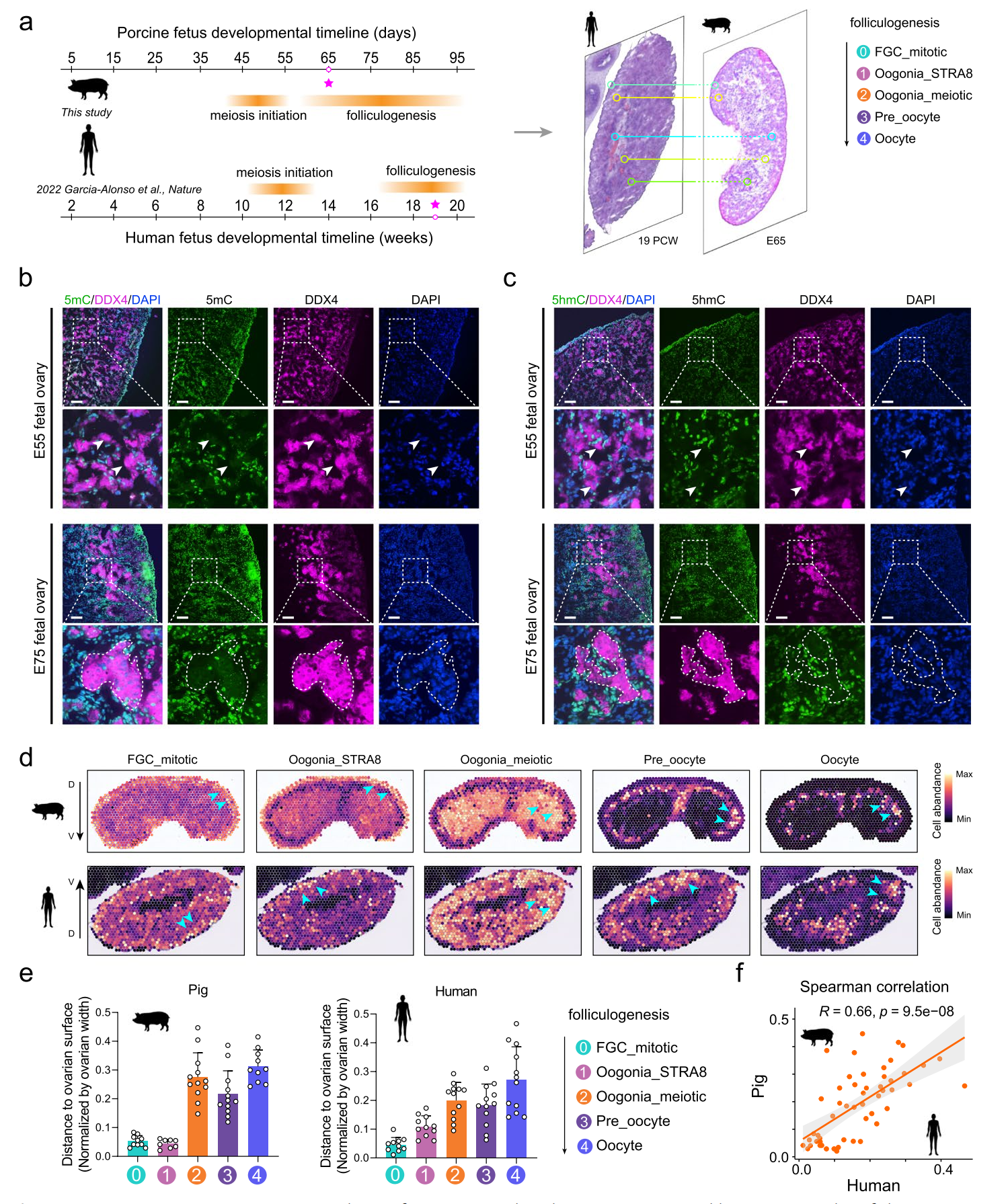 為了深入理解哺乳動物卵母細胞生成的空間調(diào)控機制,研究人員進行了跨物種分析。研究團隊首先獲取了妊娠后19周人類卵巢的空間轉(zhuǎn)錄組(ST)數(shù)據(jù),并將其與豬E65時期的ST數(shù)據(jù)進行了比較,以分析卵母細胞生成各階段生殖細胞的空間位置模式。與人類情況一致的是,生殖細胞標(biāo)記DDX4與5mC和5hmC的共染色顯示,在E55和E75豬卵巢中,5mC和5hmC信號在DDX4陽性細胞中不可檢測,且主要在周圍性腺體細胞中表達。這些結(jié)果進一步揭示,除了保守的基因表達程序外,人類和豬在早期卵母細胞生成過程中的表觀遺傳重編程模式也是保守的。