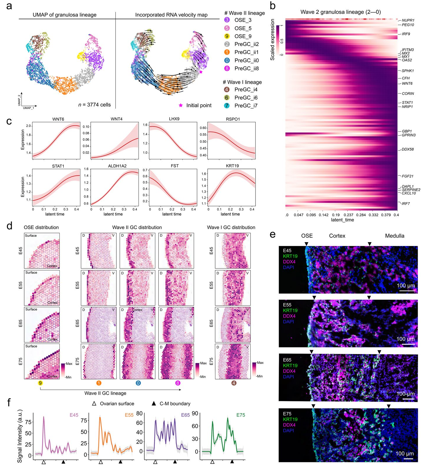 使用空間轉(zhuǎn)錄組學(xué)(ST)技術(shù)對wave I型顆粒細胞前體(PreGC_I)和wave II型顆粒細胞前體(PreGC_II)的標(biāo)志性基因進行了空間定位。結(jié)果發(fā)現(xiàn),LHX9(PreGC_I的標(biāo)志)和GREM1(PreGC_II的標(biāo)志)的信號從E45到E75在卵巢中呈現(xiàn)特定的空間分布模式。在E65和E75,GREM1的信號明顯環(huán)繞著DDX4(生殖細胞的標(biāo)志)的信號,表明卵巢卵泡組裝的早期階段,wave II型顆粒細胞(來源于皮質(zhì)區(qū)域的顆粒細胞前體)在卵巢卵泡組裝過程中發(fā)揮了關(guān)鍵作用。