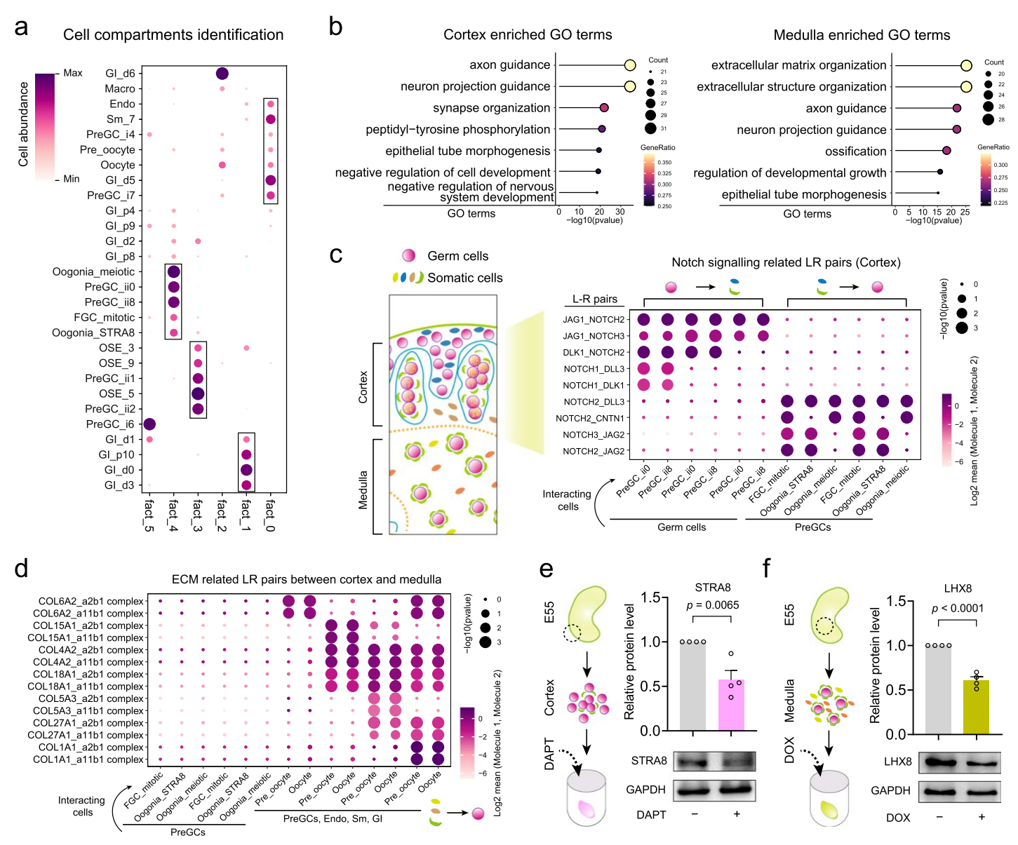 為了進一步驗證細胞通訊分析,研究人員接下來探討了在使用從E55卵巢皮質(zhì)和髓質(zhì)中分離的卵巢組織進行體外條件下,補充NOTCH信號抑制劑DAPT和基質(zhì)金屬蛋白酶抑制劑多西環(huán)素是否會影響生殖細胞命運。從E55胎兒卵巢中解剖出皮質(zhì)和髓質(zhì)組織,將這些組織進行體外培養(yǎng),并在用DAPT處理10天后觀察到皮質(zhì)卵巢組織中減數(shù)分裂標(biāo)志物STRA8的表達水平顯著降低,而髓質(zhì)卵巢組織則沒有這種情況。相反,在用基質(zhì)金屬蛋白酶抑制劑多西環(huán)素處理10天后,觀察到卵泡形成標(biāo)志物L(fēng)HX8的表達水平降低,而在皮質(zhì)組織中未觀察到可比的影響。綜上所述,這些數(shù)據(jù)進一步支持了在空間背景下的細胞-細胞通訊分析,并強調(diào)了卵巢微環(huán)境在調(diào)節(jié)生殖細胞命運中的重要作用。