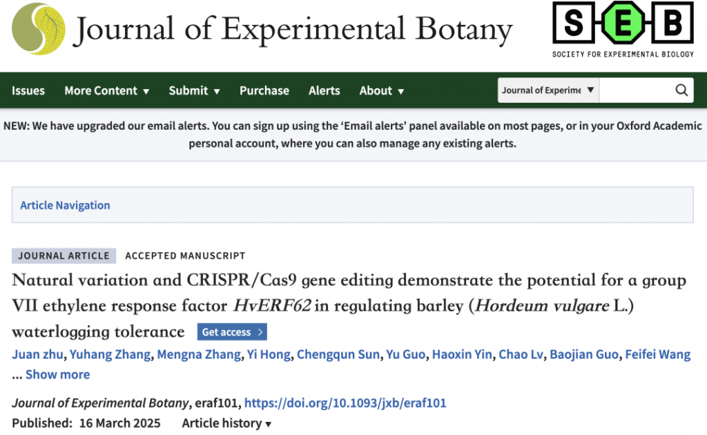 揚(yáng)州大學(xué)Rugen Xu團(tuán)隊(duì)在《Journal of Experimental Botany》雜志發(fā)表題為“Natural variation and CRISPR/Cas9 gene editing demonstrate the potential for a group VII ethylene response factor HvERF62 in regulating barley (Hordeum vulgare L.) waterlogging tolerance”的論文,揭示了大麥VII類(lèi)乙烯反應(yīng)因子?HvERF62?通過(guò)調(diào)控氣孔形成、活性氧穩(wěn)態(tài)和碳水化合物積累,從而提高大麥耐漬澇能力。