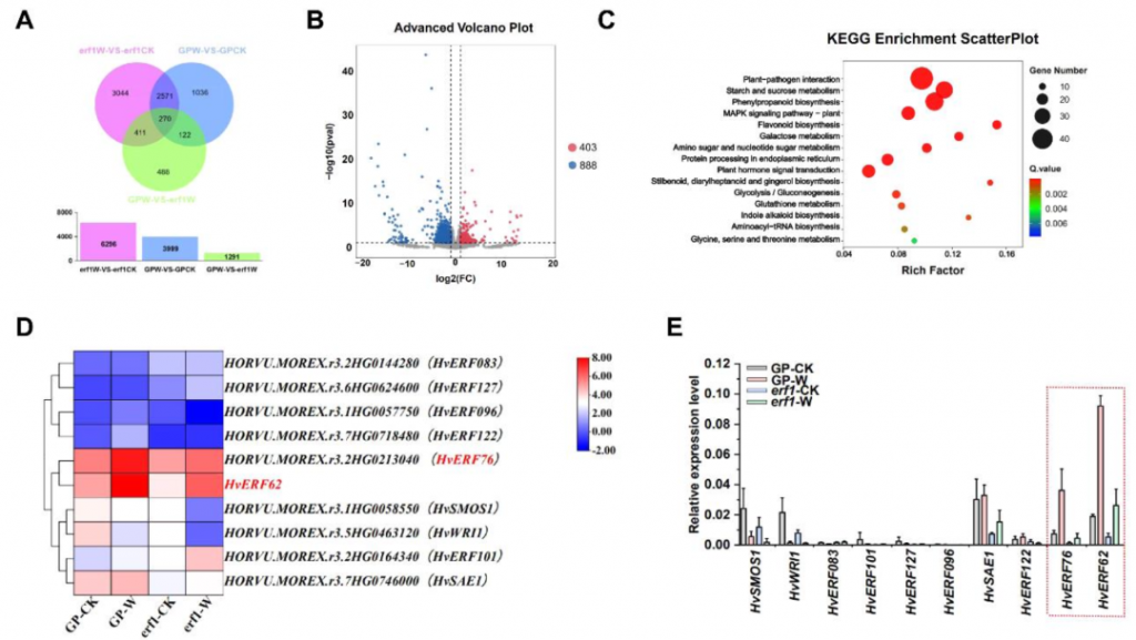 對(duì)野生型和 HvERF62 突變體進(jìn)行轉(zhuǎn)錄組測(cè)序分析。結(jié)果顯示,在漬澇脅迫下,突變體中有403個(gè)基因上調(diào)表達(dá),888個(gè)基因下調(diào)表達(dá)(圖5A, 5B)。KEGG富集分析表明,這些差異表達(dá)基因顯著富集在植物-病原互作、淀粉和蔗糖代謝、苯丙烷類(lèi)生物合成、MAPK信號(hào)通路、植物激素信號(hào)轉(zhuǎn)導(dǎo)、糖酵解/糖異生等通路中(圖5C)。