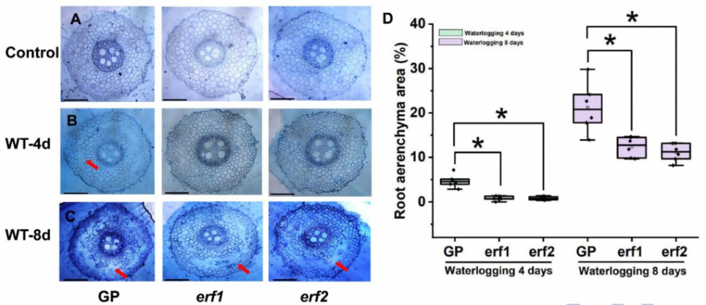 利用CRISPR/Cas9基因編輯技術(shù),獲得了3個(gè)獨(dú)立的 HvERF62 純合突變體(erf1、erf2、erf3)。這些突變體在正常條件下與野生型(GP)的生長(zhǎng)發(fā)育沒(méi)有顯著差異。然而,在漬澇脅迫下,突變體的不定根數(shù)量顯著少于野生型,且根長(zhǎng)、地上部干重、根干重和葉綠素含量均顯著低于野生型(圖4B-4F)。