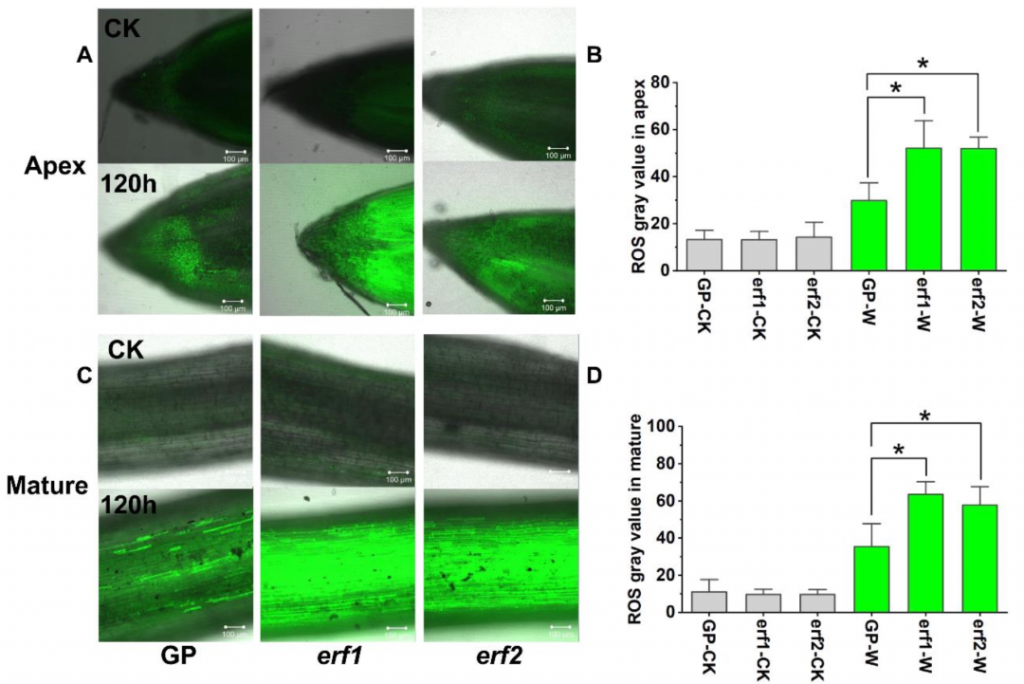 細(xì)胞活力染色實(shí)驗(yàn)表明,在漬澇脅迫下,HvERF62 突變體根部的細(xì)胞死亡程度高于野生型(圖8)。ROS熒光染色實(shí)驗(yàn)表明,在漬澇脅迫下,突變體根部積累了更多的ROS(圖9)。此外,突變體中H2O2含量顯著高于野生型,而CAT和GSH活性顯著低于野生型(圖7A-7C)。