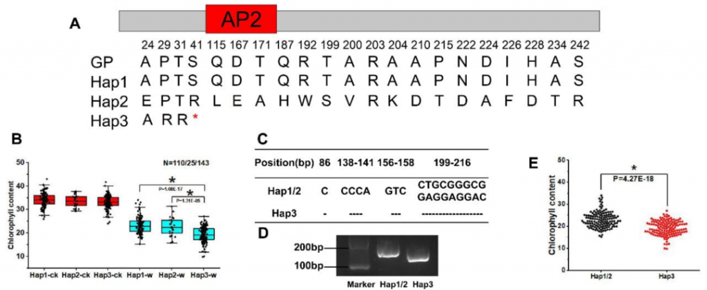 對(duì)自然群體中 HvERF62 基因的序列進(jìn)行分析,發(fā)現(xiàn)存在43個(gè)SNPs和4個(gè)InDels。根據(jù)這些變異,將種質(zhì)資源分為3個(gè)單倍型(Hap1、Hap2和Hap3)。其中,Hap3由于序列變異導(dǎo)致編碼提前終止。在漬澇脅迫下,Hap1和Hap2的葉綠素含量顯著高于Hap3(圖10A, 10B)?;贗nDel變異設(shè)計(jì)的分子標(biāo)記可用于區(qū)分不同單倍型(圖10C-10E)。