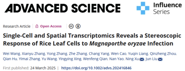 2025年3月24日,中國農(nóng)業(yè)大學(xué)植物保護(hù)學(xué)院劉俊團(tuán)隊(duì)在國際綜合性期刊《Advanced Science》上,在線發(fā)表了題為“Single-Cell and Spatial Transcriptomics Reveals a Stereoscopic Response of Rice Leaf Cells to?Magnaportheoryzae?Infection”的研究長文,該研究利用單細(xì)胞核轉(zhuǎn)錄組測(cè)序和空間轉(zhuǎn)錄組測(cè)序技術(shù),深度分析了水稻-稻瘟菌互作下的細(xì)胞空間立體響應(yīng),并構(gòu)建了一個(gè)全新的水稻-稻瘟菌互作單細(xì)胞和時(shí)空組轉(zhuǎn)錄圖譜。