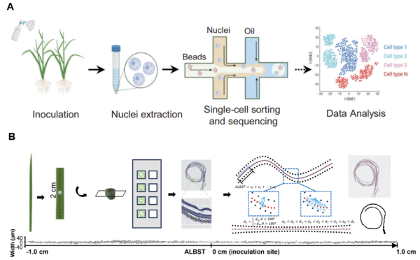 單細(xì)胞組學(xué)和時(shí)空組學(xué)是近年來生命科學(xué)領(lǐng)域的重要技術(shù)突破,它們?cè)诩?xì)胞異質(zhì)性解析、動(dòng)態(tài)過程研究和細(xì)胞間相互作用分析方面具有重要優(yōu)勢(shì),為生命科學(xué)研究帶來了全新的視角和深度。水稻稻瘟病是世界上發(fā)生嚴(yán)重的真菌病害之一,水稻在面臨稻瘟菌侵染時(shí)會(huì)激活動(dòng)態(tài)免疫,因此挖掘水稻特異免疫基因?qū)τ诳沟疚敛【秩局陵P(guān)重要。