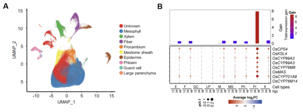對(duì)測(cè)序獲得的單細(xì)胞數(shù)據(jù),結(jié)合細(xì)胞特異的標(biāo)志基因,AddModuleScore?軟件和GO富集分析等方法,對(duì)水稻的細(xì)胞類型進(jìn)行了分類注釋(圖2A)?;虮磉_(dá)分析發(fā)現(xiàn),維管細(xì)胞中的原形成層細(xì)胞在稻瘟菌侵染后高度誘導(dǎo)二萜類植保素合成代謝相關(guān)基因的表達(dá),其中水稻關(guān)鍵植保素momilactone A合成被特異誘導(dǎo)(圖2B),促進(jìn)了momilactone A在維管組織中積累,可能是抗稻瘟病的關(guān)鍵因素。相反,激素途徑和模式分子激發(fā)的免疫對(duì)抗病性貢獻(xiàn)較弱。