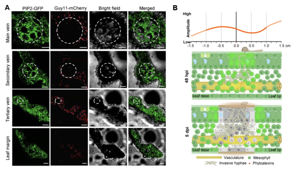 共聚焦顯微鏡觀察結(jié)果顯示,稻瘟菌孢子萌發(fā)后優(yōu)先靶向葉脈入侵,但是水稻的維管組織具有較強(qiáng)的免疫,稻瘟菌菌絲無法進(jìn)一步侵入(圖3A)。時(shí)空組測(cè)序結(jié)果顯示,富含亮氨酸重復(fù)序列的(NLR)免疫基因的表達(dá)在接種24小時(shí)后,葉尖部較葉基部具有更強(qiáng)的積累,表明免疫基因的表達(dá)具有極性的特征。綜上所述,該項(xiàng)研究揭示了水稻在稻瘟病菌侵染時(shí)免疫基因存在細(xì)胞特異性和多維(局部和縱向)的表達(dá)模式,為挖掘新的免疫基因提供了重要的數(shù)據(jù)基礎(chǔ)(圖3B)。