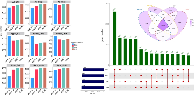 甲基化DMR分析結(jié)果顯示,SURFseq 5000 測序數(shù)據(jù)(Z007及Z008)鑒定DMR數(shù)要多于Nova X plus測序同批數(shù)據(jù)(B921-7及B921-8),且根據(jù)韋恩圖統(tǒng)計結(jié)果來看,SURFseq 5000 測序兩個重復樣本重合的DMR較Nova X plus測序的兩重復樣本更多,測序結(jié)果一致性更好。實測數(shù)據(jù)顯示:SURFseq能夠完美復刻甚至優(yōu)于國際主流平臺的數(shù)據(jù)質(zhì)量。