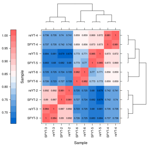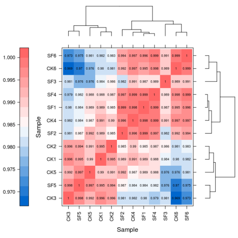 Trans及LncRNA文庫SURFseq 5000及Nova X plus平臺各重復樣本相關性統(tǒng)計,整體相關性在98%以上,數(shù)據(jù)分析結(jié)果與主流平臺結(jié)果一致性較高。