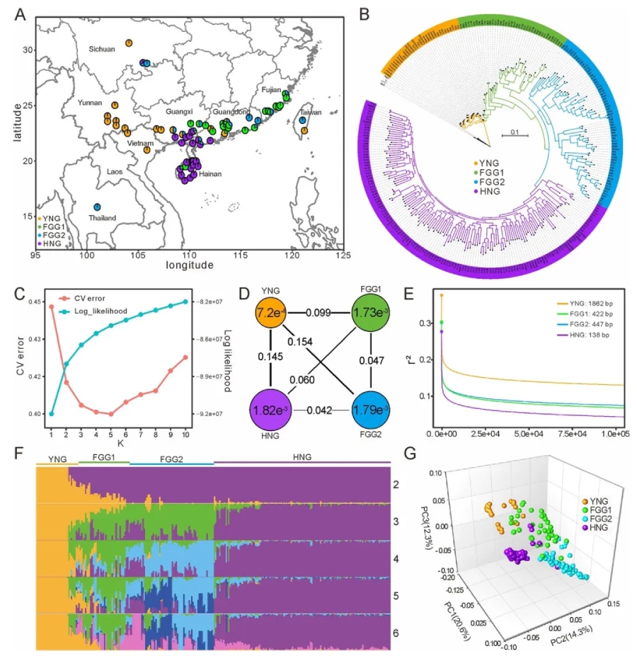 隨后,分析了群體結(jié)構(gòu),在基因組水平上揭示了群體之間的遺傳變異水平和親緣關(guān)系,分析表明該群體內(nèi)存在四個主要亞群:YNG(云南亞群,來自云南野生、廣西大興的種質(zhì))、HNG(海南亞群,來自海南和廣地博白的種質(zhì))、FGG1, 和FGG2亞群(包含來自福建和部分廣東、廣西的種質(zhì))。YNG的核苷酸多樣性低于HNG、FGG1和FGG2的,LD遺傳距離的大于其他三個亞群(圖1)。