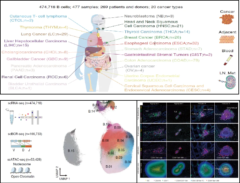 2024年,復旦大學附屬中山醫(yī)院樊嘉院士和高強教授、中國科學院上海免疫與感染研究所張曉明研究員、浙江大學基礎醫(yī)學院郭國驥教授合作在Science上發(fā)表了題為A blueprint for tumor-infiltrating B cells across human cancers的研究論文,結(jié)合單細胞轉(zhuǎn)錄組、 B細胞受體免疫組庫和表觀基因組的多組學數(shù)據(jù),系統(tǒng)性地刻畫了腫瘤浸潤性B細胞的異質(zhì)性、動態(tài)分化和表觀調(diào)控機制。創(chuàng)新地揭示了腫瘤微環(huán)境中廣泛存在的EF應答的癌種偏好性、空間定位特征、臨床意義及潛在的誘導調(diào)控機制。