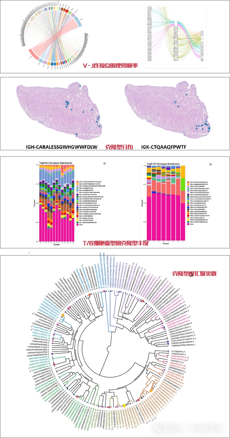 腫瘤樣本我們可以類比為一處具有復雜地貌的特殊地理環(huán)境,不同的環(huán)境造就了各種細胞的不同狀態(tài),而T/B細胞在不同的“選擇壓力”下邊進行了不同的“適應性進化”。對不同生態(tài)位的T/B細胞尤其是TCR/BCR進行測定,有助于我們?nèi)ソ沂久庖呒毎目寺∑鹪春瓦M化過程。例如,通過分析TCR的VDJ重排,可以追蹤T細胞克隆的起源和擴增過程。這種分析有助于理解免疫細胞在不同生理和病理狀態(tài)下的動態(tài)變化。