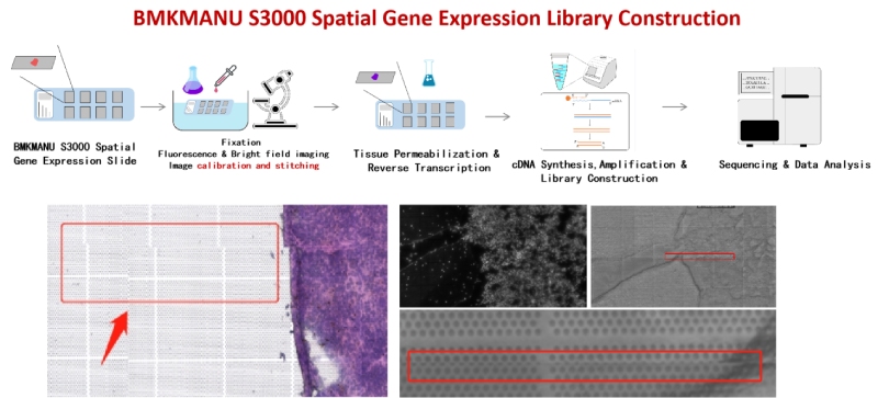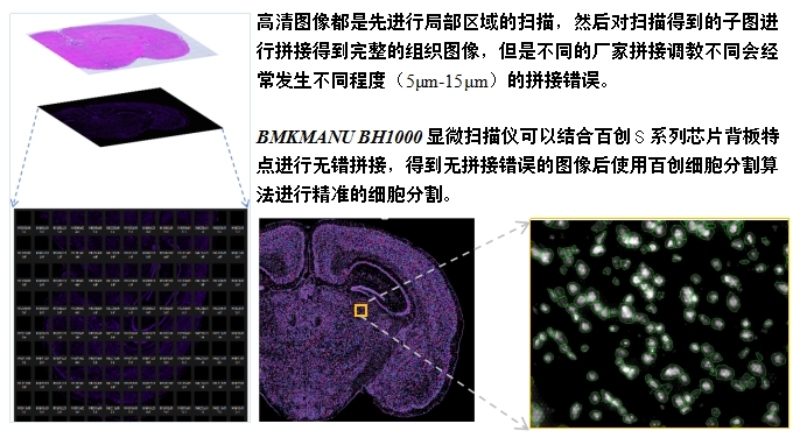 可以利用BH1000對(duì)明場(chǎng)及熒光掃描過(guò)程中經(jīng)常出現(xiàn)的拼接錯(cuò)誤進(jìn)行校準(zhǔn)(自主研發(fā)BMCHiper軟件,搭配自研半透半返模塊,實(shí)現(xiàn)圖像無(wú)錯(cuò)校準(zhǔn)),得到原片無(wú)錯(cuò)高清的熒光圖像與原片無(wú)錯(cuò)高清的明場(chǎng)圖像,為后續(xù)空間數(shù)據(jù)準(zhǔn)確的定位和可視化提供基礎(chǔ),使得復(fù)雜的轉(zhuǎn)錄組數(shù)據(jù)能夠轉(zhuǎn)化為最直觀,最精準(zhǔn)的生物學(xué)見(jiàn)解。
