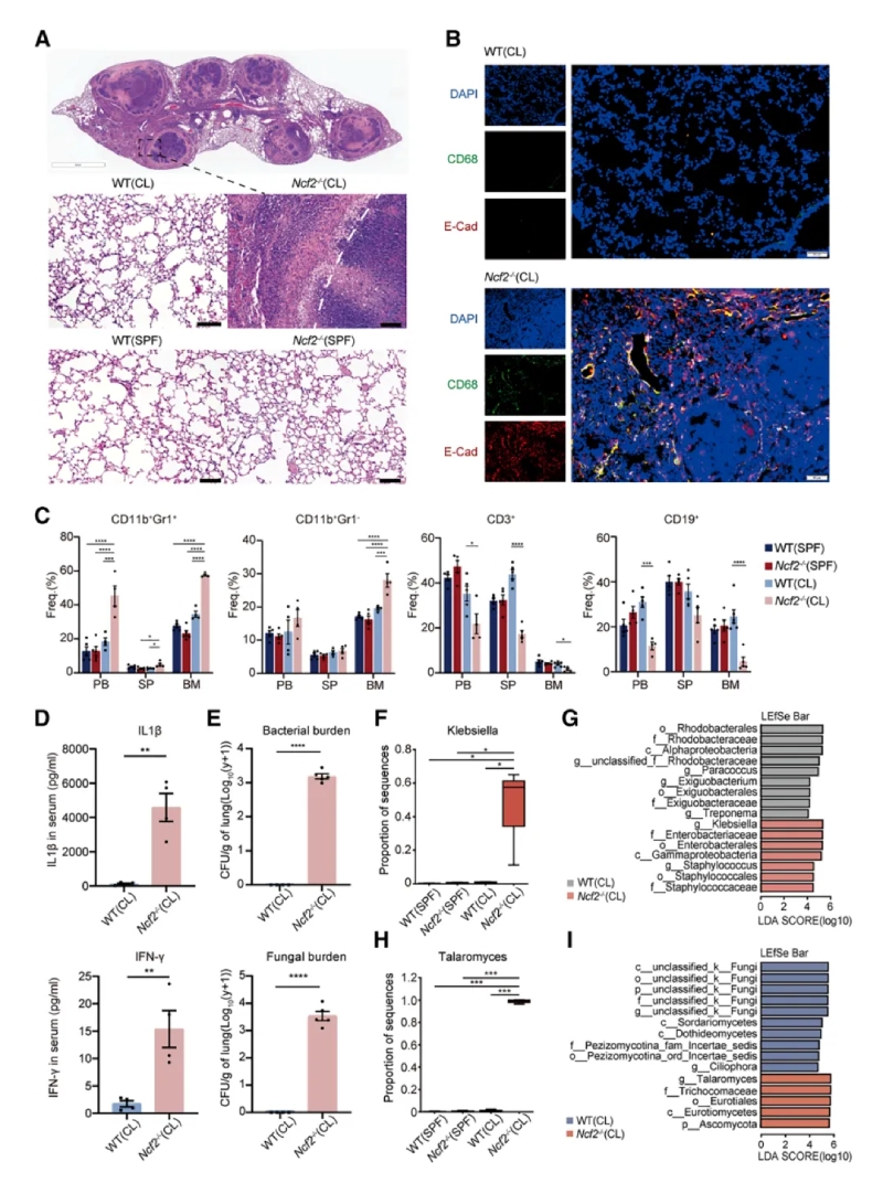 通過不同環(huán)境暴露(SPF或CL)實(shí)驗(yàn),系統(tǒng)研究了環(huán)境病原體對CGD遺傳背景小鼠表型的影響。表現(xiàn)為HE染色全肺葉顯微圖像可見CL環(huán)境下的Ncf2?/?小鼠肺部出現(xiàn)明顯的肉芽腫結(jié)構(gòu),伴隨炎癥細(xì)胞浸潤和組織壞死,其他組小鼠肺部正常。免疫熒光顯示肉芽腫中的巨噬細(xì)胞(CD68+)表達(dá)上皮標(biāo)志物E-cadherin,提示巨噬細(xì)胞發(fā)生上皮樣轉(zhuǎn)化。通過ELISA法檢測CL?Ncf2?/?小鼠血清中的IL-1β和IFN-γ炎癥相關(guān)蛋白水平較CL?WT組增加。16S?rRNA/ITS?測序顯示CL?Ncf2?/?小鼠肺部細(xì)菌(如克雷伯菌和葡萄球菌)和真菌(如Talaromyces)負(fù)荷顯著增加。