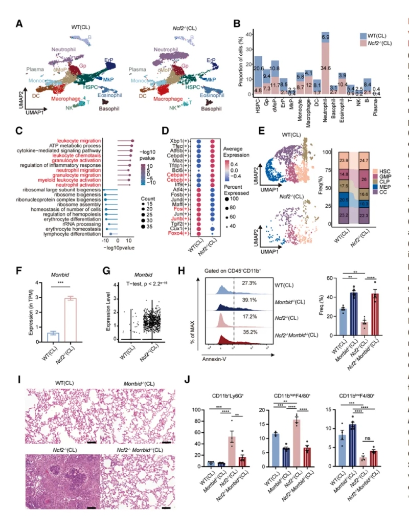 慢性肉芽腫病(Chronic?Granulomatous?Disease,?CGD)是一種由NADPH氧化酶2(NOX2)復(fù)合體功能缺失突變引起的原發(fā)性免疫缺陷病。這種缺陷會導(dǎo)致產(chǎn)生ROS的多種先天免疫細(xì)胞受到損害,機(jī)體抵御微生物的能力下降,導(dǎo)致CGD患者易發(fā)生反復(fù)感染和過度炎癥反應(yīng)。本研究通過構(gòu)建自然CGD小鼠模型,結(jié)合單細(xì)胞轉(zhuǎn)錄組(scRNA-seq)和空間轉(zhuǎn)錄組技術(shù)(包括BMKMANU?S1000平臺),深入解析了CGD肺部肉芽腫形成的細(xì)胞與分子機(jī)制,從CGD肺肉芽腫組織中鑒定出具有NOS2高表達(dá)特征的中性粒細(xì)胞和MMP12+巨噬細(xì)胞,并提出MIF和Morbidity為CGD治療的潛在靶點(diǎn)。