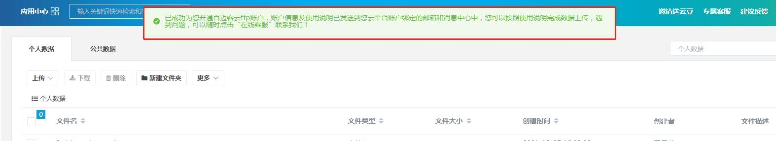 FTP 上傳:數(shù)據(jù)量大于 200M 時使用 FTP 上傳數(shù)據(jù)。選擇“FTP 上傳”后彈出提示對話框,點(diǎn)擊“確定”后系統(tǒng)會自動創(chuàng)建一次性的 FTP 賬戶,用于本次數(shù)據(jù)上傳。賬戶信息會發(fā)送至注冊郵箱及平臺的“個人中心——消息中心”中。依照提示操作即可。