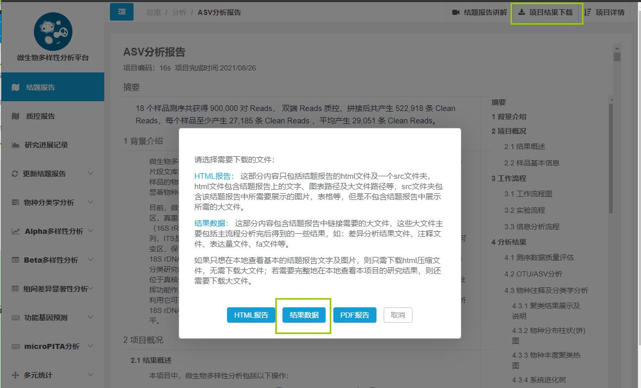 6 新報告結(jié)果下載:打開新的報告,點(diǎn)擊這份報告的右上角-項目結(jié)果下載-進(jìn)行下載結(jié)果數(shù)據(jù),就可以得到更新的這份報告的全部結(jié)果。