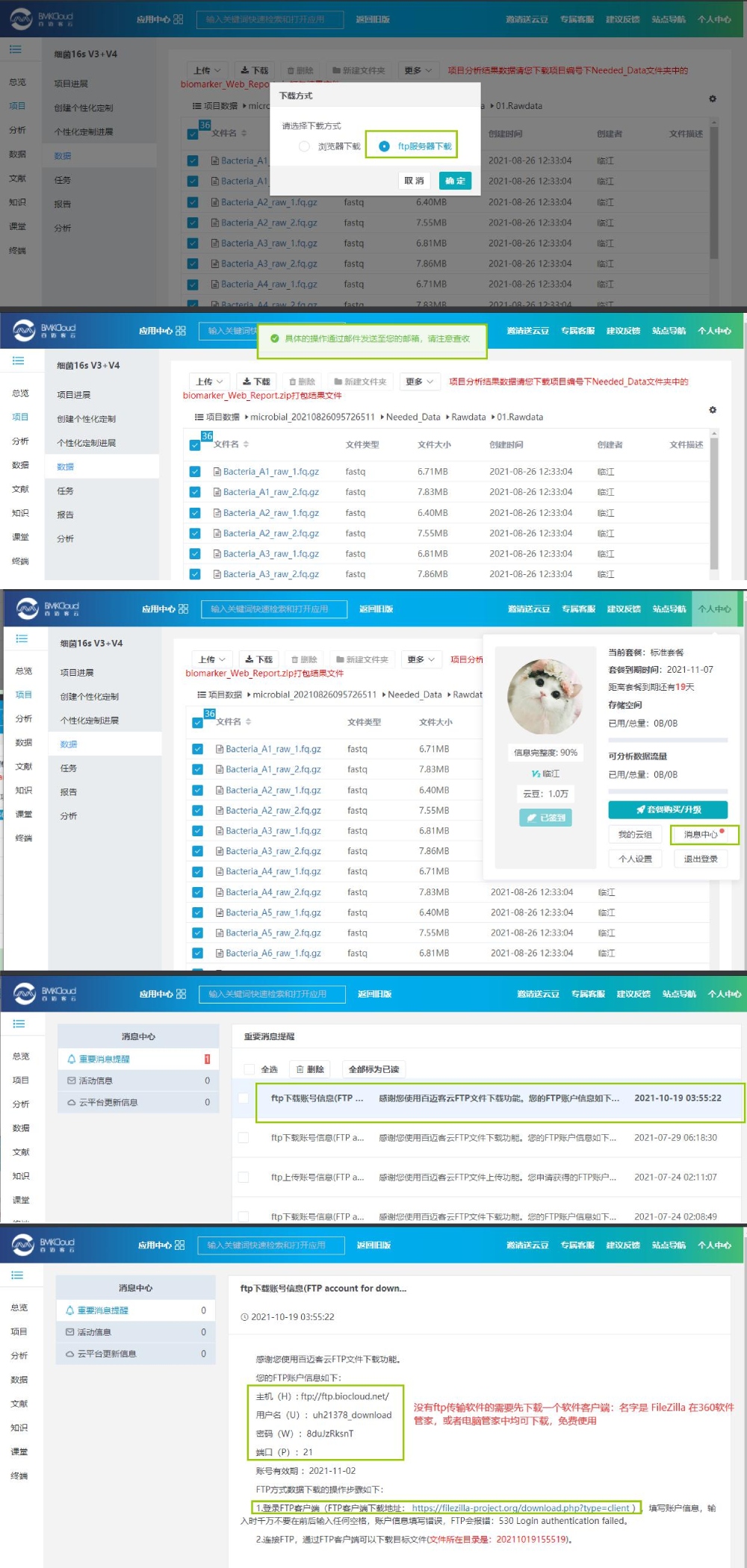 FTP 下載指導(dǎo):下載方式選擇 FTP 下載,平臺會將具體的操作步驟發(fā)到注冊郵箱賬號中,也會發(fā)到個人中心信息中,如下:
