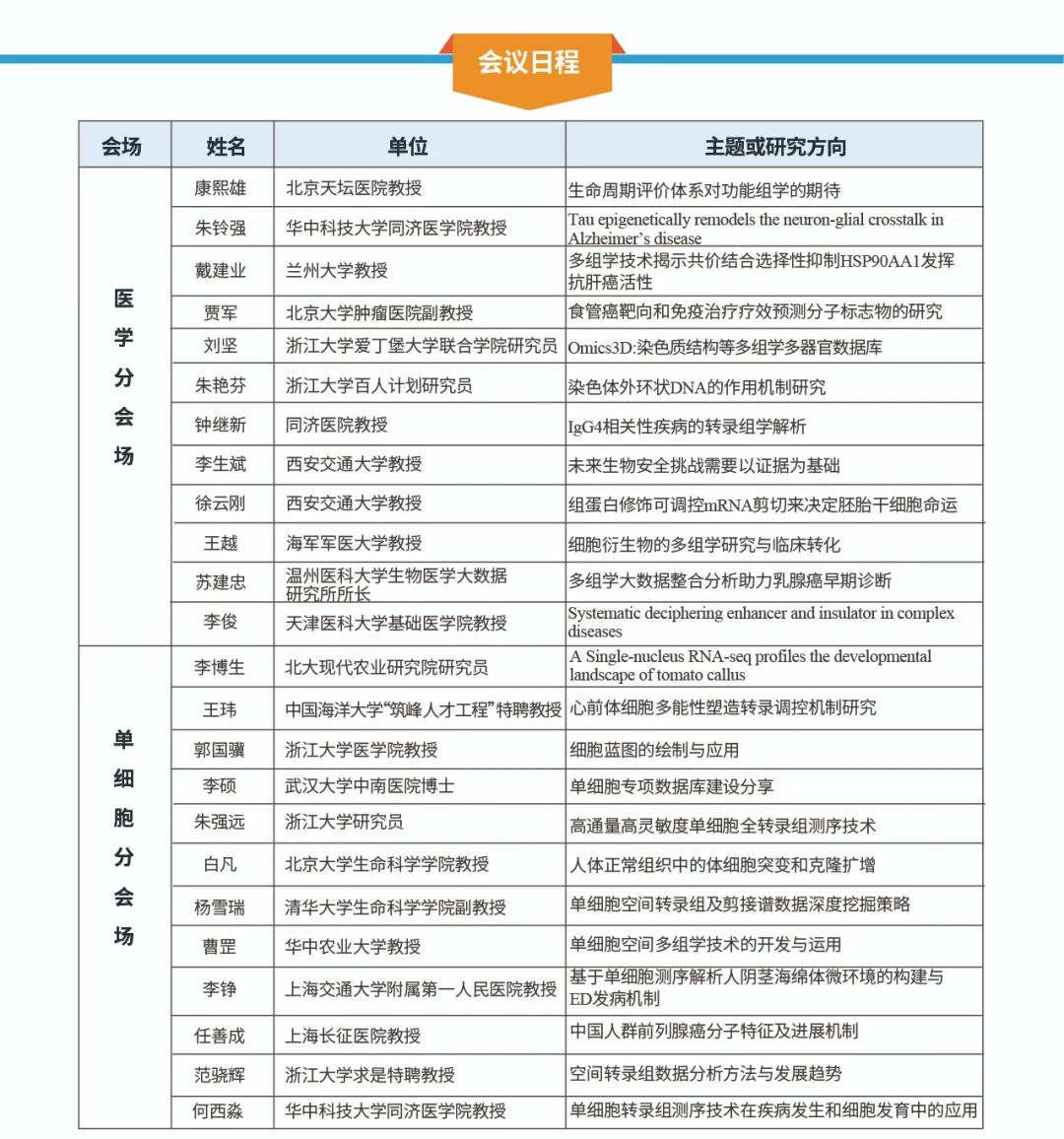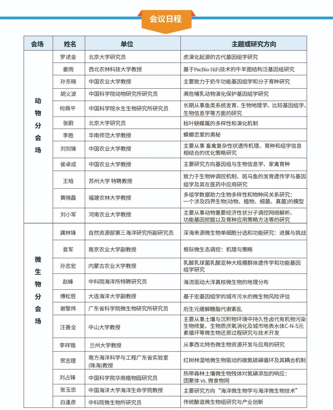 22日報道,23日主會場,24日五個分會場(植物功能基因組學(xué)研究會場、動物多組學(xué)應(yīng)用研究會場、微生物質(zhì)譜多組學(xué)研究會場、醫(yī)學(xué)多組學(xué)精準(zhǔn)診療應(yīng)用研究會場、時空多組學(xué)技術(shù)發(fā)展及應(yīng)用會場)并行,25-27日為期刊講座及培訓(xùn)課程。
