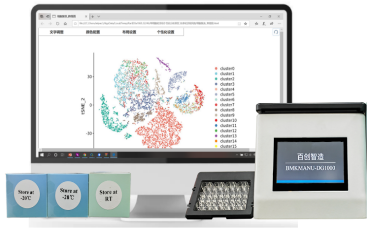 為了突破單細(xì)胞試劑耗材及儀器長期以來的國外技術(shù)壟斷,降低單細(xì)胞應(yīng)用的成本,讓單細(xì)胞技術(shù)能夠惠及更多的科研群體,經(jīng)過多年潛心研發(fā),百創(chuàng)智造發(fā)布自主研發(fā)的極速單細(xì)胞微液滴系統(tǒng)-百創(chuàng)DG1000。百創(chuàng)DG1000是基于微流控、油滴包裹和Barcode標(biāo)記等技術(shù)來實現(xiàn)高通量的細(xì)胞捕獲。除了儀器以外,百創(chuàng)DG1000還有配套的2×4的獨立芯片及配套試劑盒(圖4)。