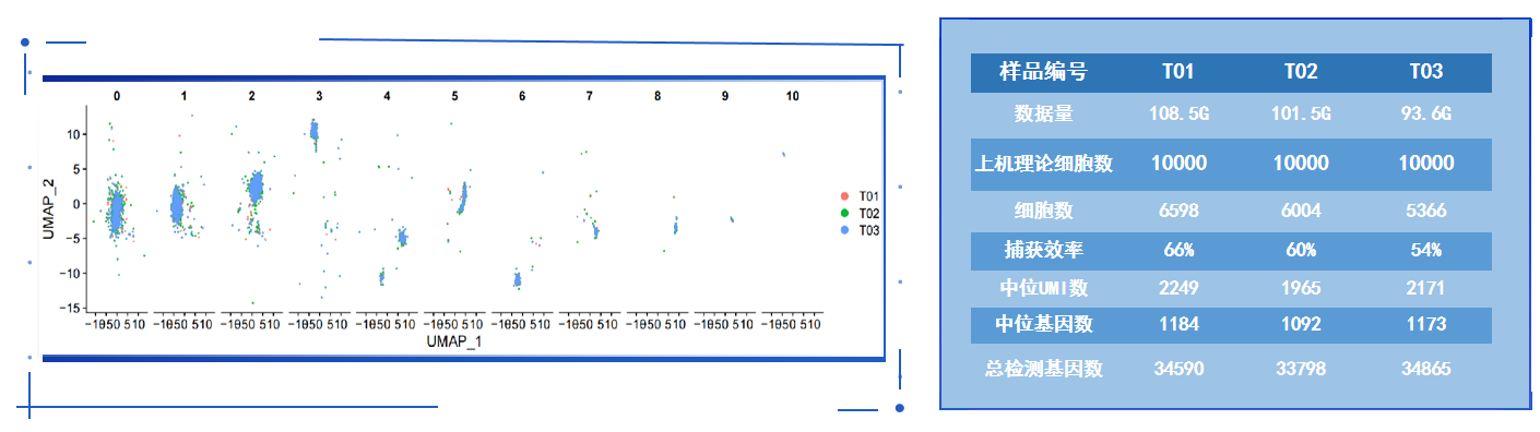 PBMC重復(fù)性檢測:將相同的PBMC細(xì)胞懸液分3份,通過3個不同實驗人員,用3臺百創(chuàng)DG1000儀器,獨立進(jìn)行單細(xì)胞測序,得到了幾乎一致的細(xì)胞聚類分群結(jié)果,證明百創(chuàng)DG1000具有很好的可重復(fù)性及穩(wěn)定性(圖5)。