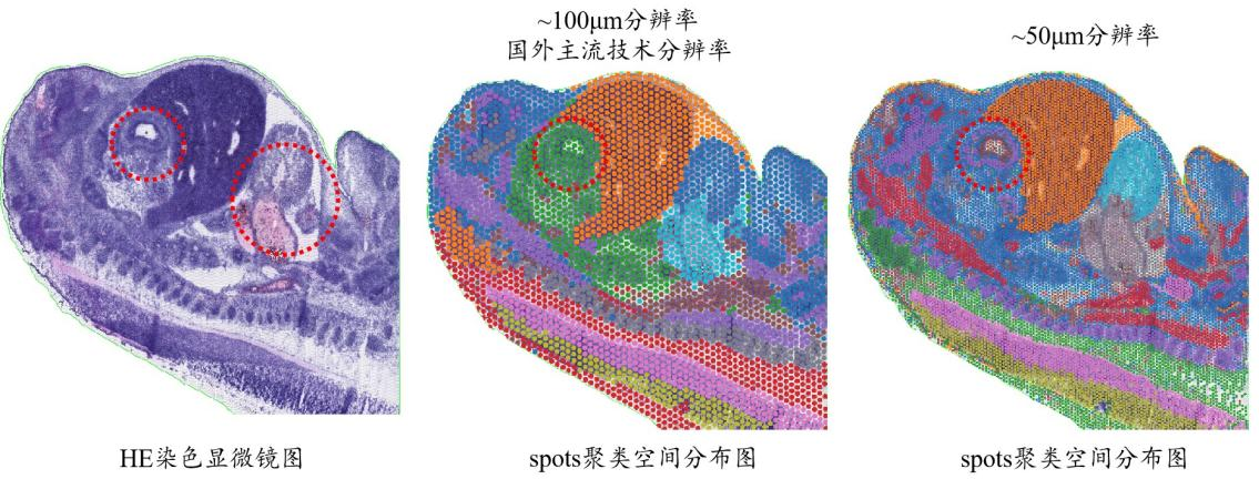 大鼠胚胎亞細(xì)胞分辨率實測數(shù)據(jù)展示:與100μm分辨率(主流技術(shù)平臺)對比,高分辨率(~50μm)下HE染色組織形態(tài)學(xué)與spots聚類空間分布圖重合度更高,精準(zhǔn)識別空間基因表達(dá)的異質(zhì)性和組織區(qū)域的特異性(圖7)。