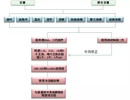甘薯和野生甘薯,不同組織(幼葉、成熟葉、莖尖、莖稈、須根、起始?jí)K根、膨大塊根和成熟塊根)分別等重量混合,提取RNA用于三代測(cè)序;同樣的材料用于二代測(cè)序。
